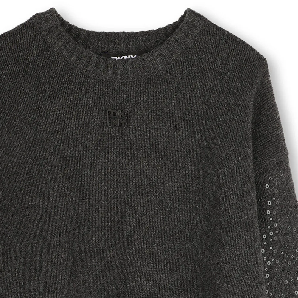 L´élégance sans effort rencontre le charme espiègle dans la robe DKNY D62390. Cette robe en maille sophistiquée à manches longues est conçue pour la jeune fashionista, offrant un confort inégalé dans un tissu doux en mélange de coton. Véritable pièce "mini-moi", elle permet des looks coordonnés chics. Le design est rehaussé par une touche de glamour grâce à des sequins brodés scintillants sur les manches, tandis qu´une plaque métallique DKNY signature à l´avant confirme sa qualité de créateur. Parfaite pour toute occasion, c´est une pièce maîtresse élégante, chaude et confortable pour sa garde-robe