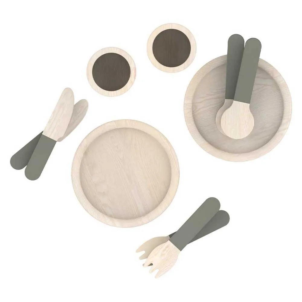 Laissez votre enfant s´exercer à prendre soin de ses invités avec cet ensemble d´assiettes, de couverts et de verres en bois.