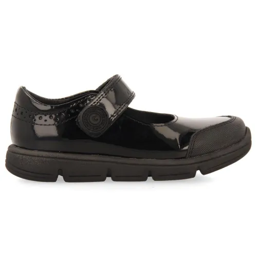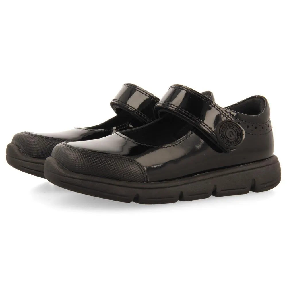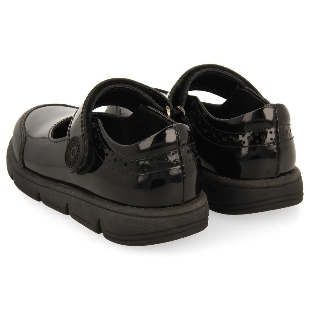 Ballerines collège en cuir verni noir avec brides réglables.
