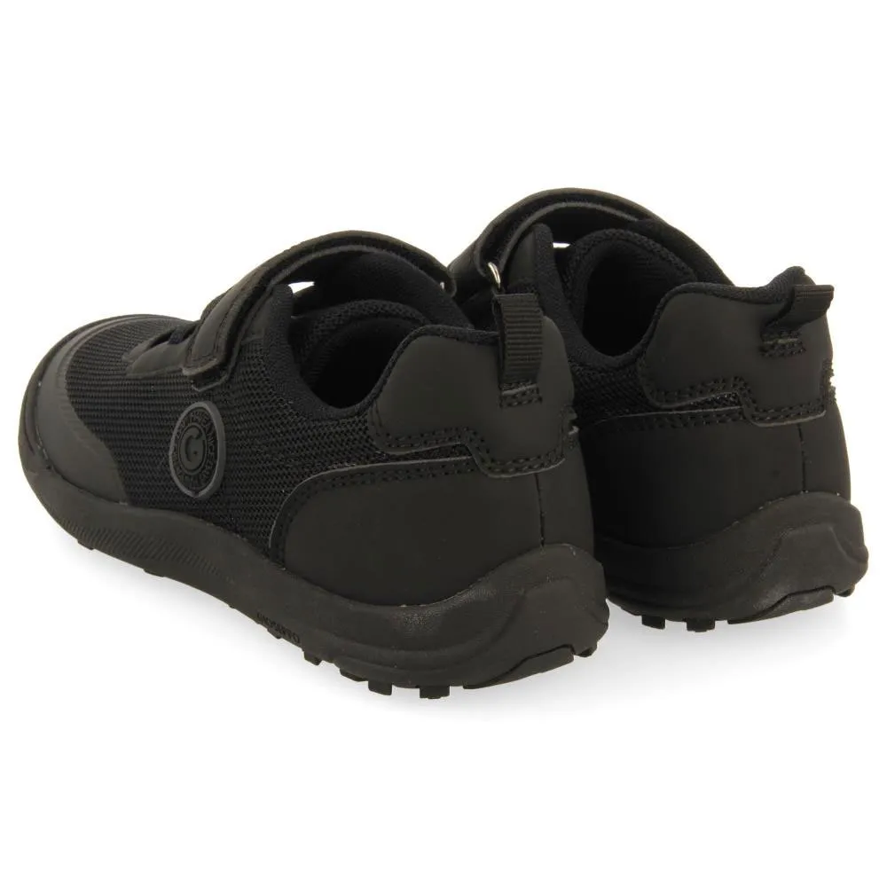 Baskets scolaires noires avec fermetures réglables et lacets élastiques.