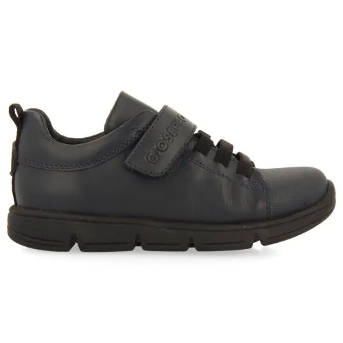 Baskets en cuir bleu foncé avec fermetures réglables et lacets élastiques.