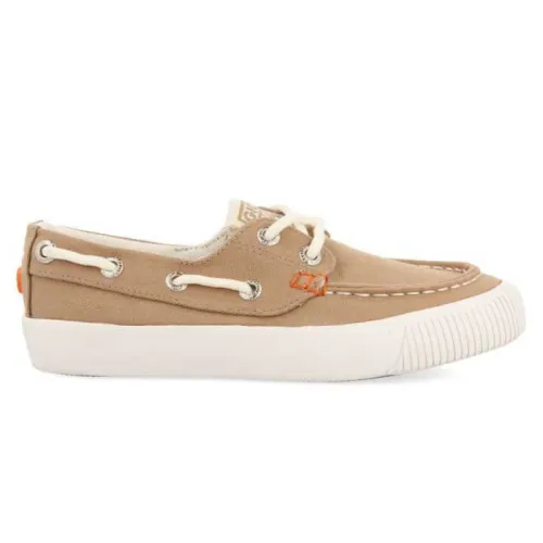 La tige est en toile et la semelle est en caoutchouc blanc avec le dessous couleur caramel.