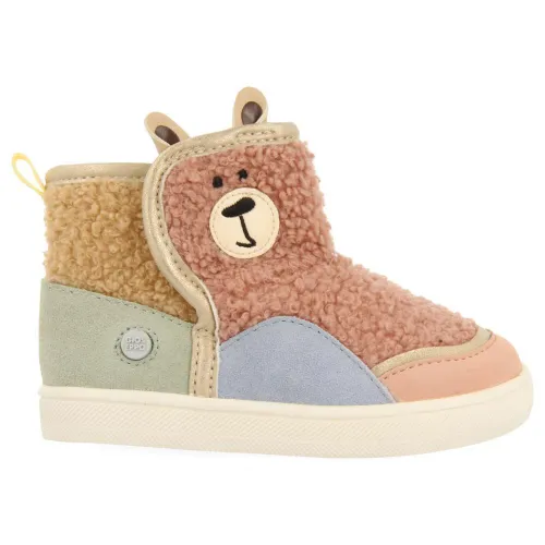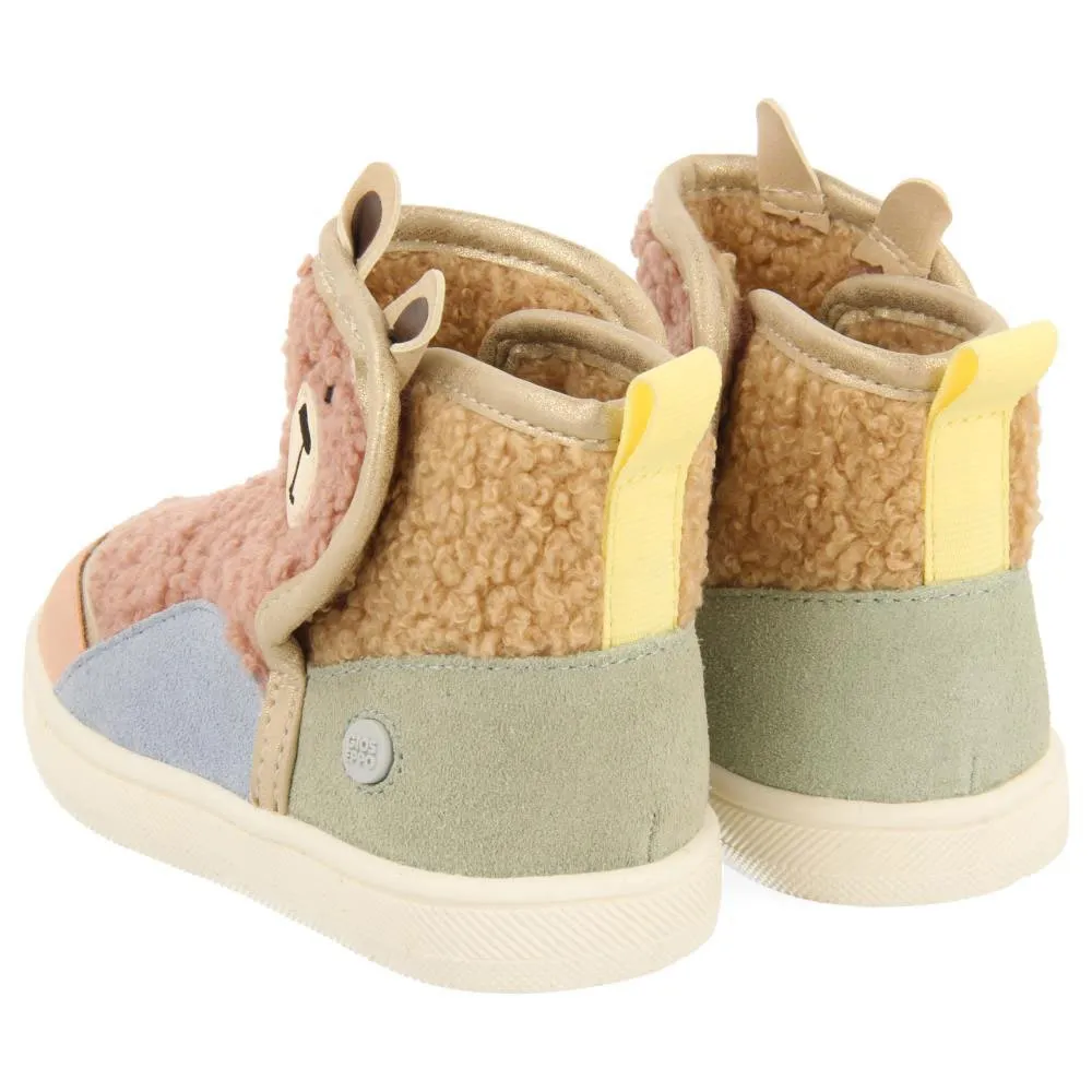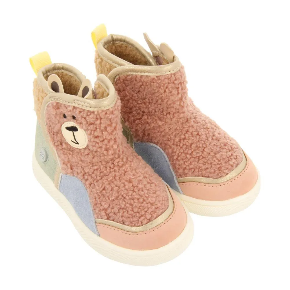 Bottines multicolores avec fourrure effet peau de mouton et petites oreilles.