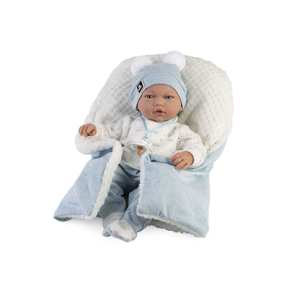 Poupée Adri, son corps est en tissu et ses membres en vinyle, il porte un pull corail à manches longues blanc avec un imprimé enfantin, une cagoule tricotée bleue avec les pieds dans le même imprimé que le pull, un bonnet tricoté bleu avec deux pompons blancs, en complément il inclut une sucette blanche et une couverture bleue doublée de fourrure blanche.