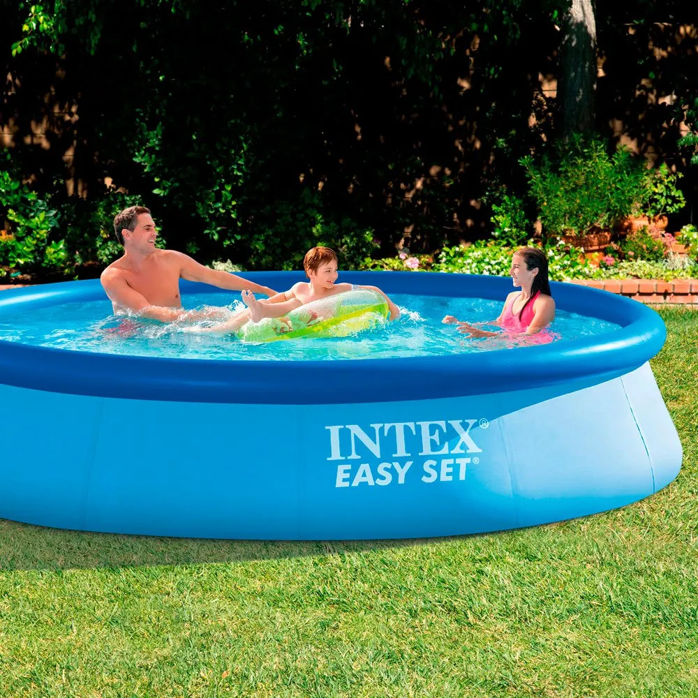 Piscine circulaire escamotable Intex Easy Set avec anneau supérieur gonflable, mesurant 366 x 76 cm, d'une capacité de 5 621 litres, pour 4 personnes (à partir de 6 ans). & Nbsp; Toile à trois couches Super Tough très résistante et durable, facile à installer: étalez sur un sol ferme et de niveau, gonflez l'anneau et remplissez. Prêt en seulement 10 minutes une fois rempli, vient avec un bouchon de vidange raccordable pour faciliter le vidage & nbsp;
