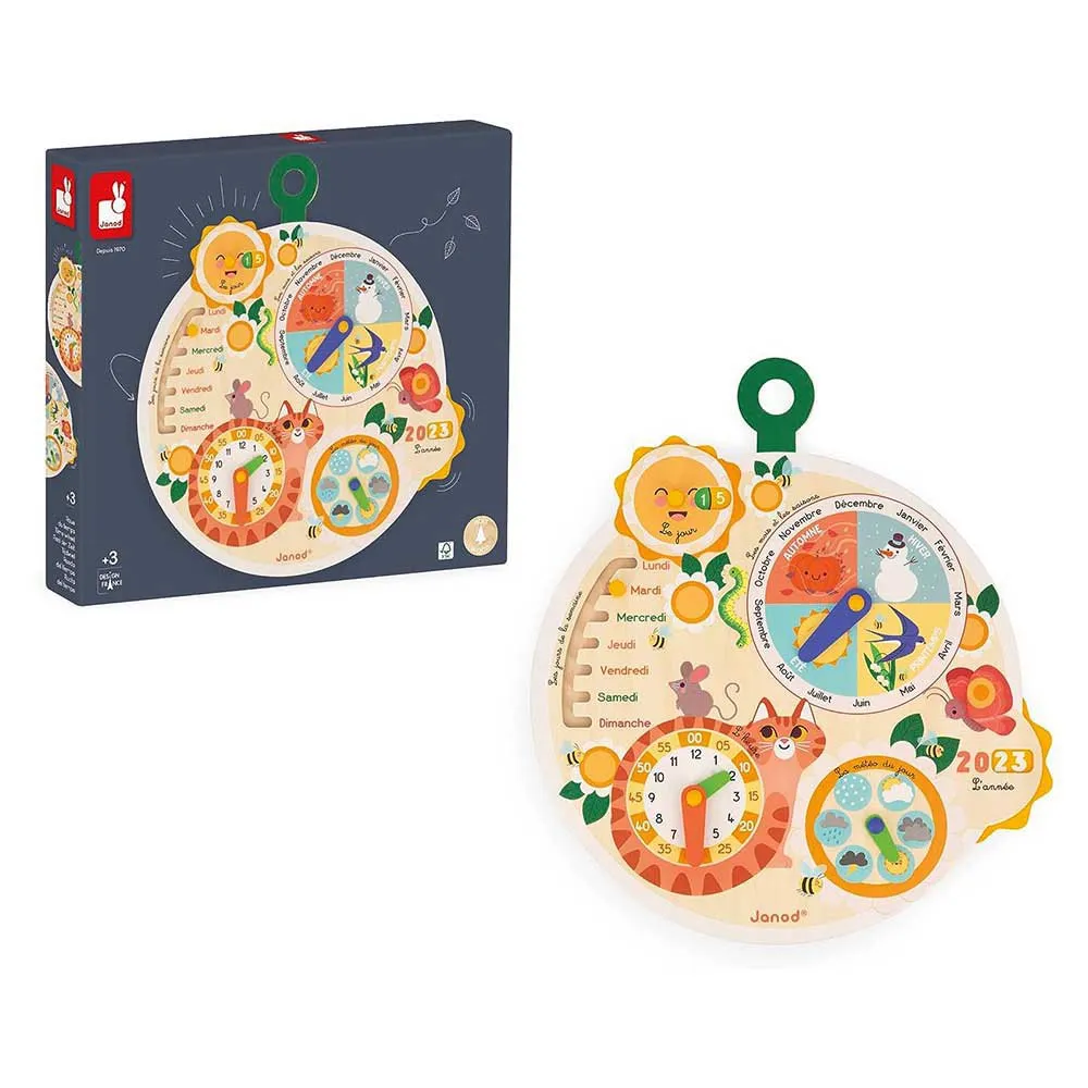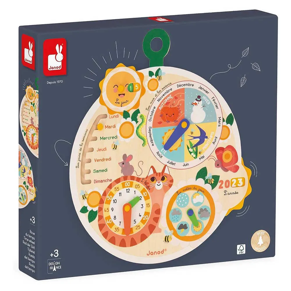 Un soleil tourne pour indiquer la date, un curseur permet d´apprendre les jours de la semaine, une horloge avec 2 aiguilles de couleur permet de différencier les heures et les minutes, un cadran météo pour que votre enfant apprenne à s´habiller seul, et enfin un cadran pour comprendre les saisons et les mois.