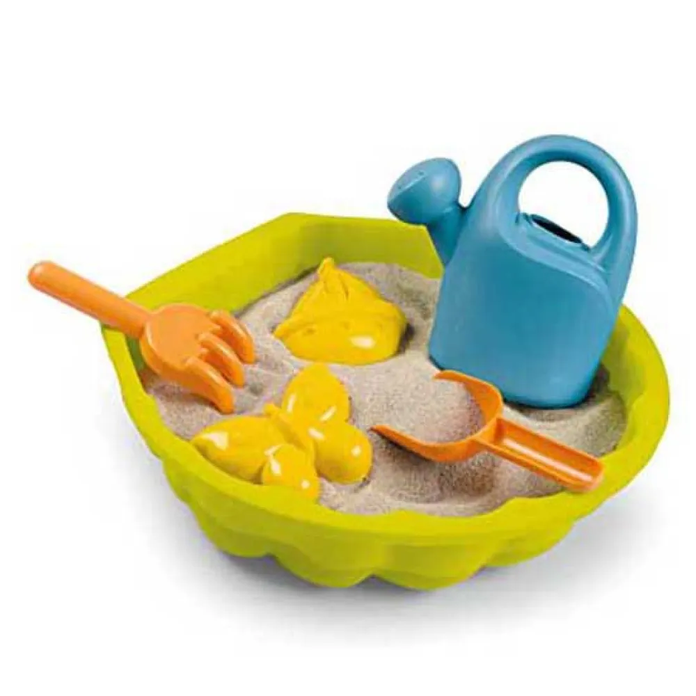 Le bac à sable est un incontournable dans un jardin ! Adapté aux petits espaces, ce mini bac à sable en forme de coquillage comblera votre enfant ! Compact et mesurant 35x35cm, vous n'aurez aucun mal à trouver une place pour ce jeu d'extérieur qui promet un gain de place ! Vous pouvez également l'utiliser comme jeu de plage. 1 pelle, 1 râteau, 2 moules à sable et 1 arrosoir sont inclus.