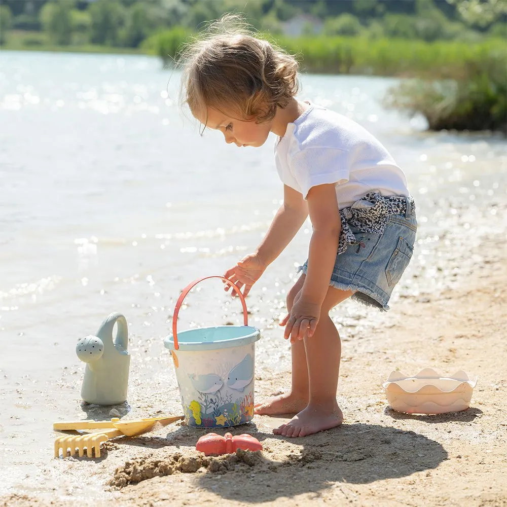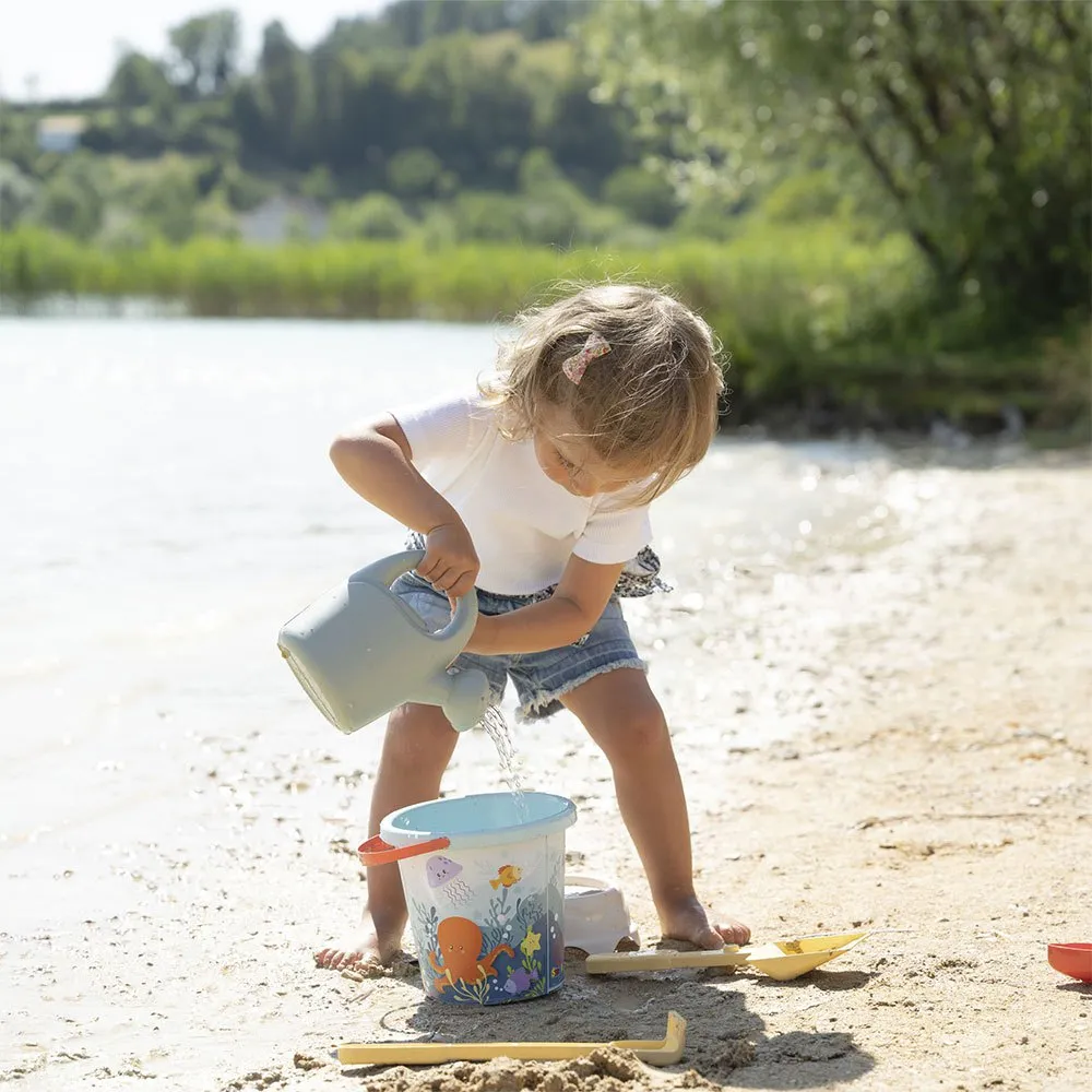 Smoby Life Beach Bucket 17cm, Fabriqué avec des matériaux recyclés, Avec arrosoir, tamis, râteau, pelle et moule à sable, À partir de 18 mois, Fabriqué en France.
