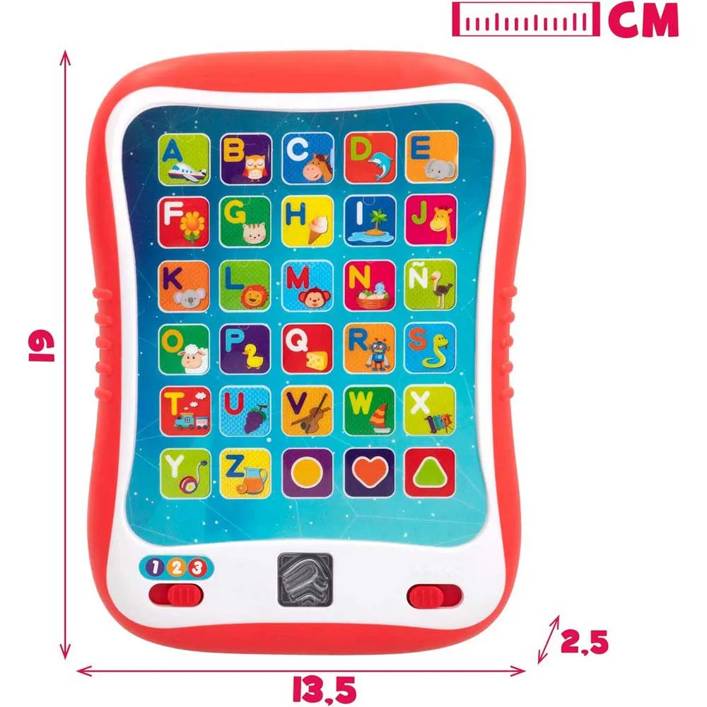 La tablette possède 30 touches avec les lettres de l´alphabet, des dessins d´animaux, d´objets et de formes géométriques qui émettent des sons lorsqu´on appuie dessus.