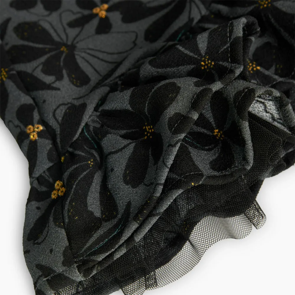 Con un design ricco di fiori, questo prodotto si distingue per il tessuto liscio e il colore nero stampato.