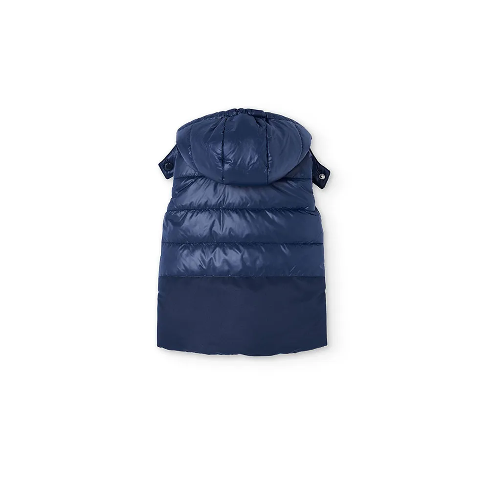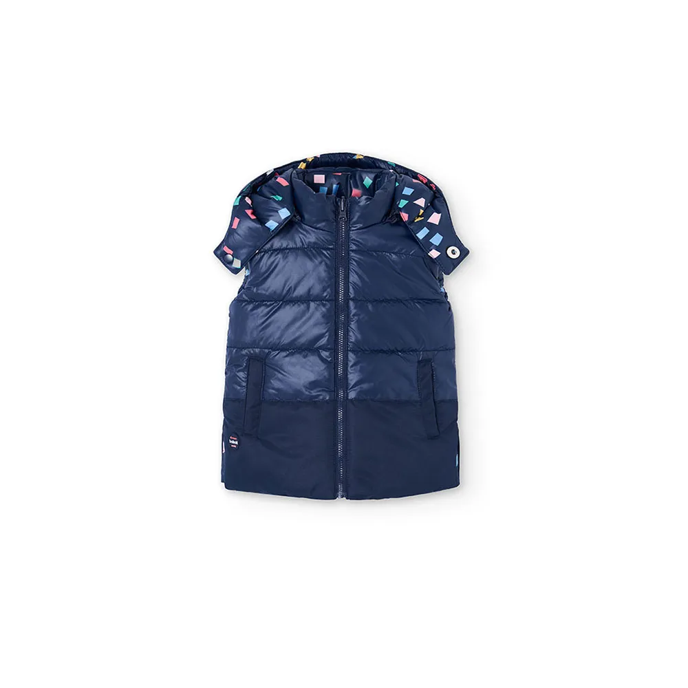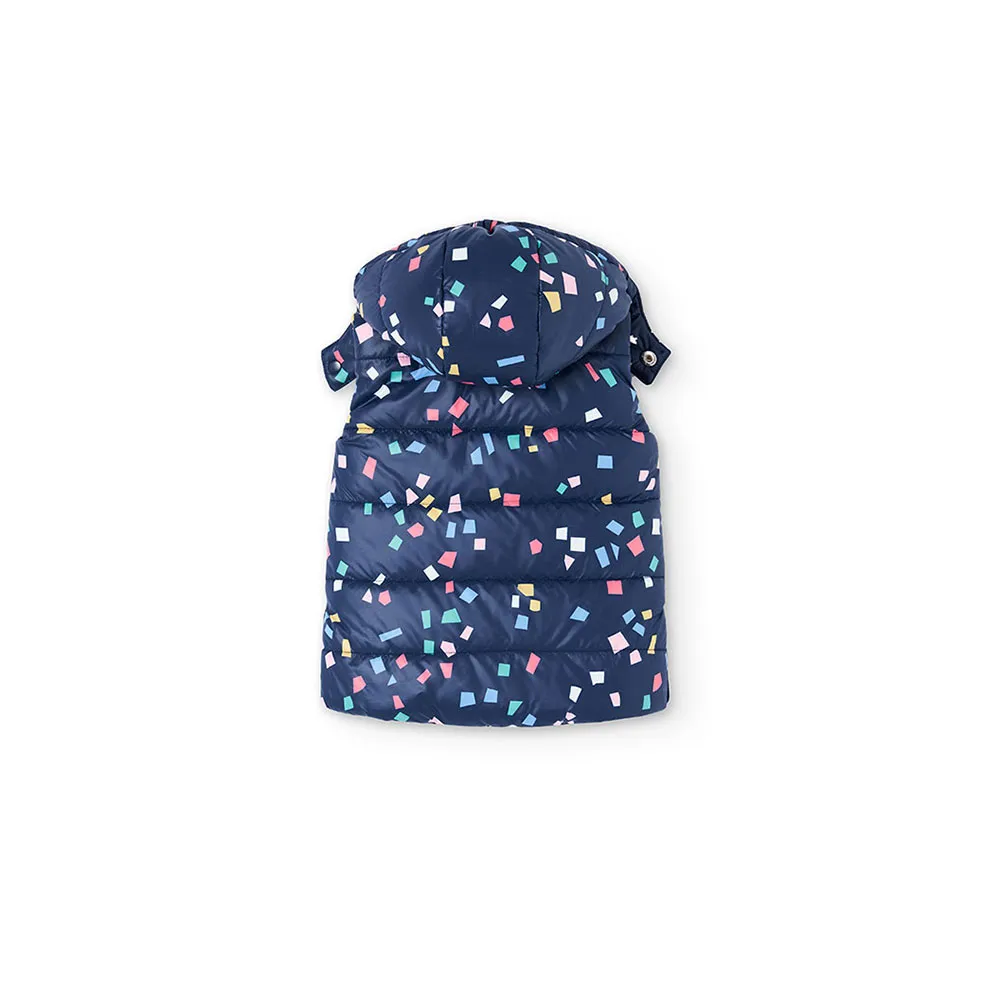 Gilet reversibile in tessuto tecnico blu navy con motivo geometrico multicolore per bambina, questo capo incantevole aggiunge un tocco di allegria al guardaroba della tua piccola.