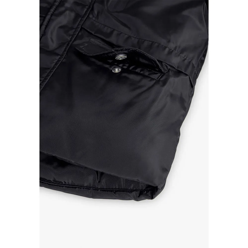 Parka in tessuto tecnico nero per ragazzi offre una combinazione perfetta di funzionalità e stile, appositamente progettata per proteggere dal freddo e dalla pioggia invernale.
