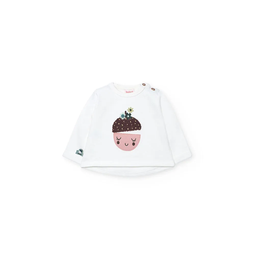 Il top, di colore bianco, presenta un allegro design con una faccina sorridente e dettagli floreali, realizzato in tessuto morbido e confortevole.