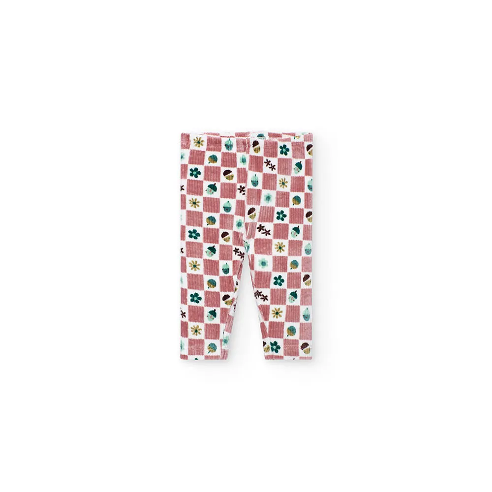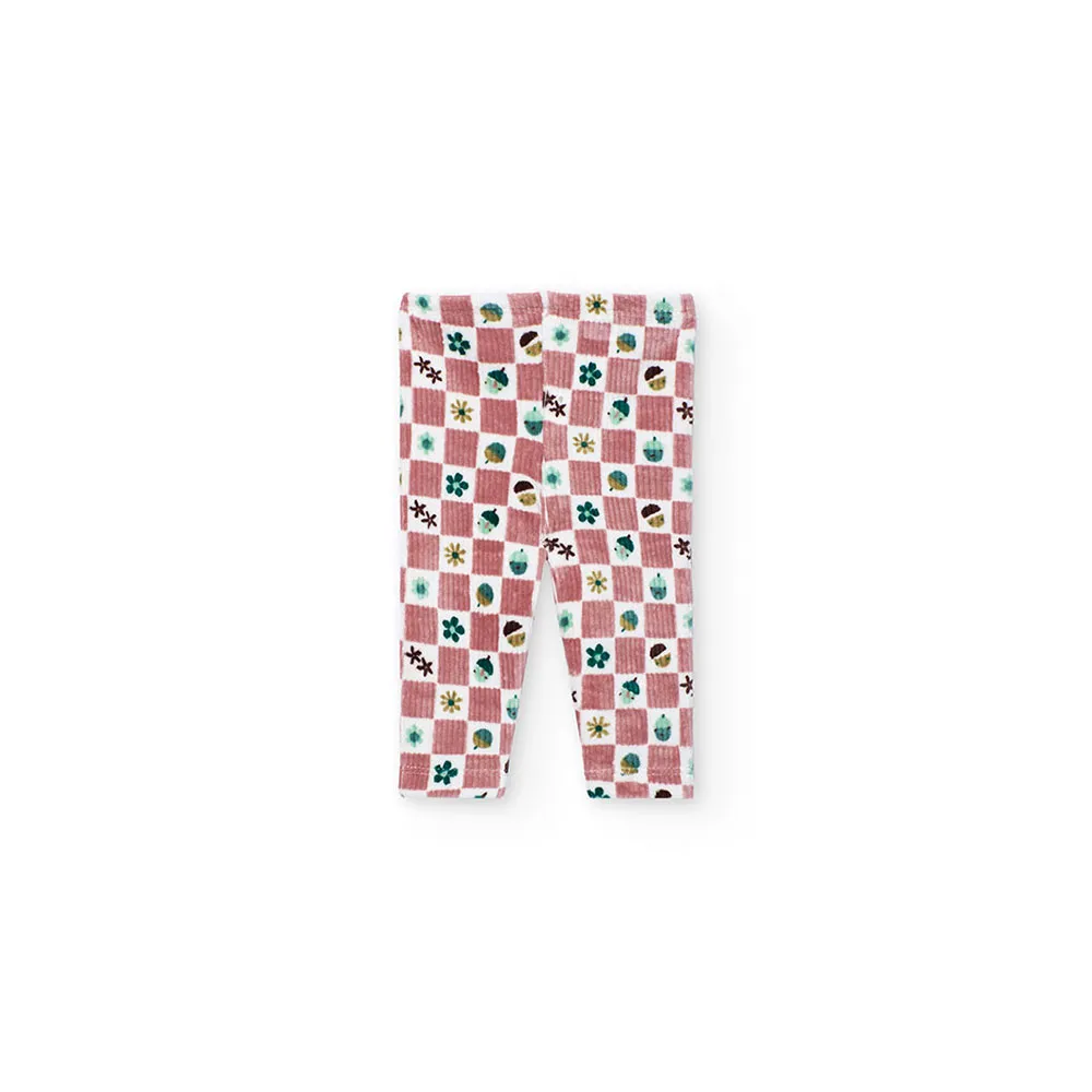 Pantaloni con stampa a quadri nelle tonalità del rosa e del marrone, impreziositi da motivi floreali e foglioline, aggiungono un tocco giocoso.