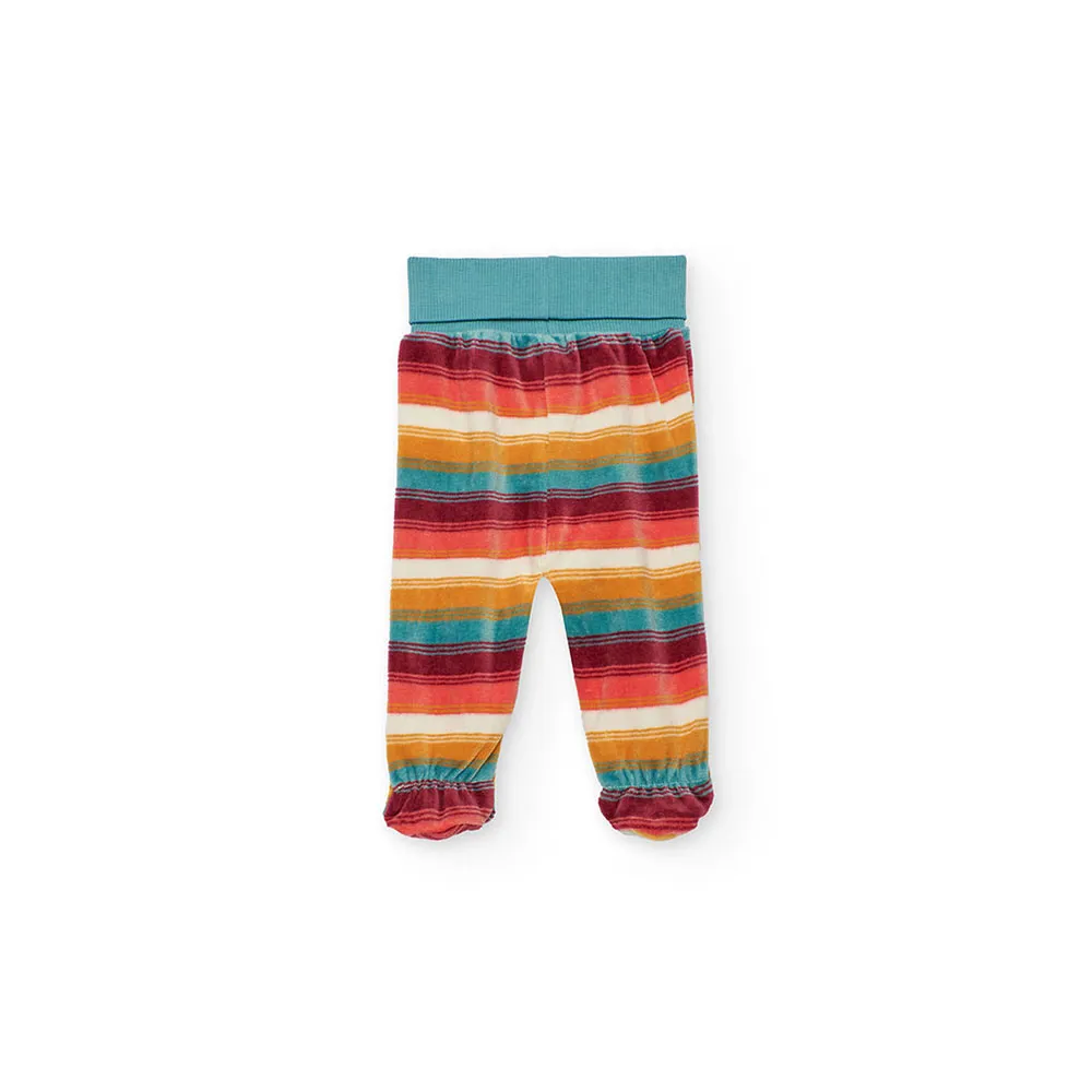 Include un adorabile maglioncino color crema con motivo animalier e pantaloni a righe multicolore che aggiungono un tocco affascinante.