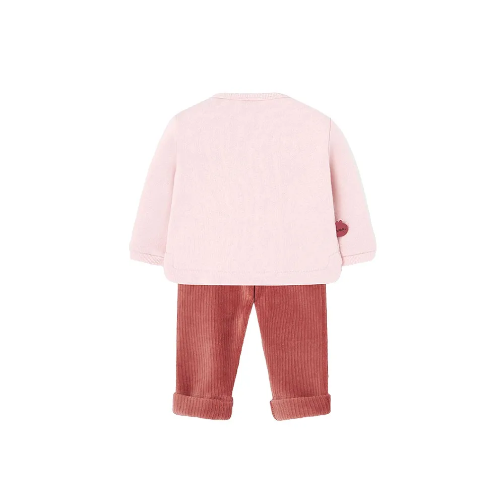 Disponibile nelle taglie da 1 mese a 2 anni, il completo include una maglia a maniche lunghe e pantaloni in maglia abbinati.