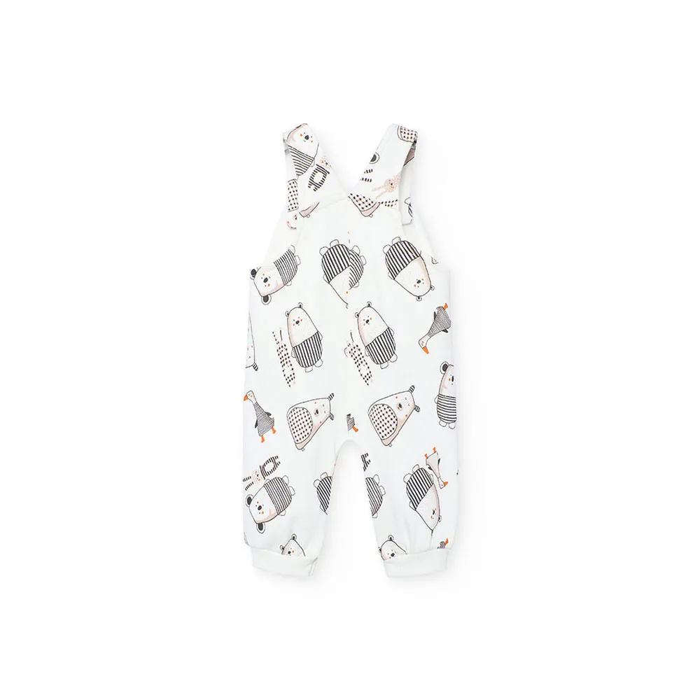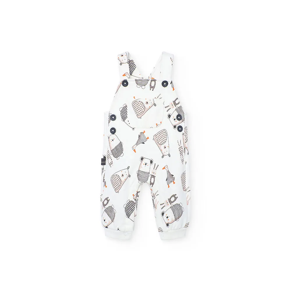 Include una comoda salopette con una graziosa stampa animalier in toni neutri e bretelle incrociate con bottoni, che facilitano il cambio.