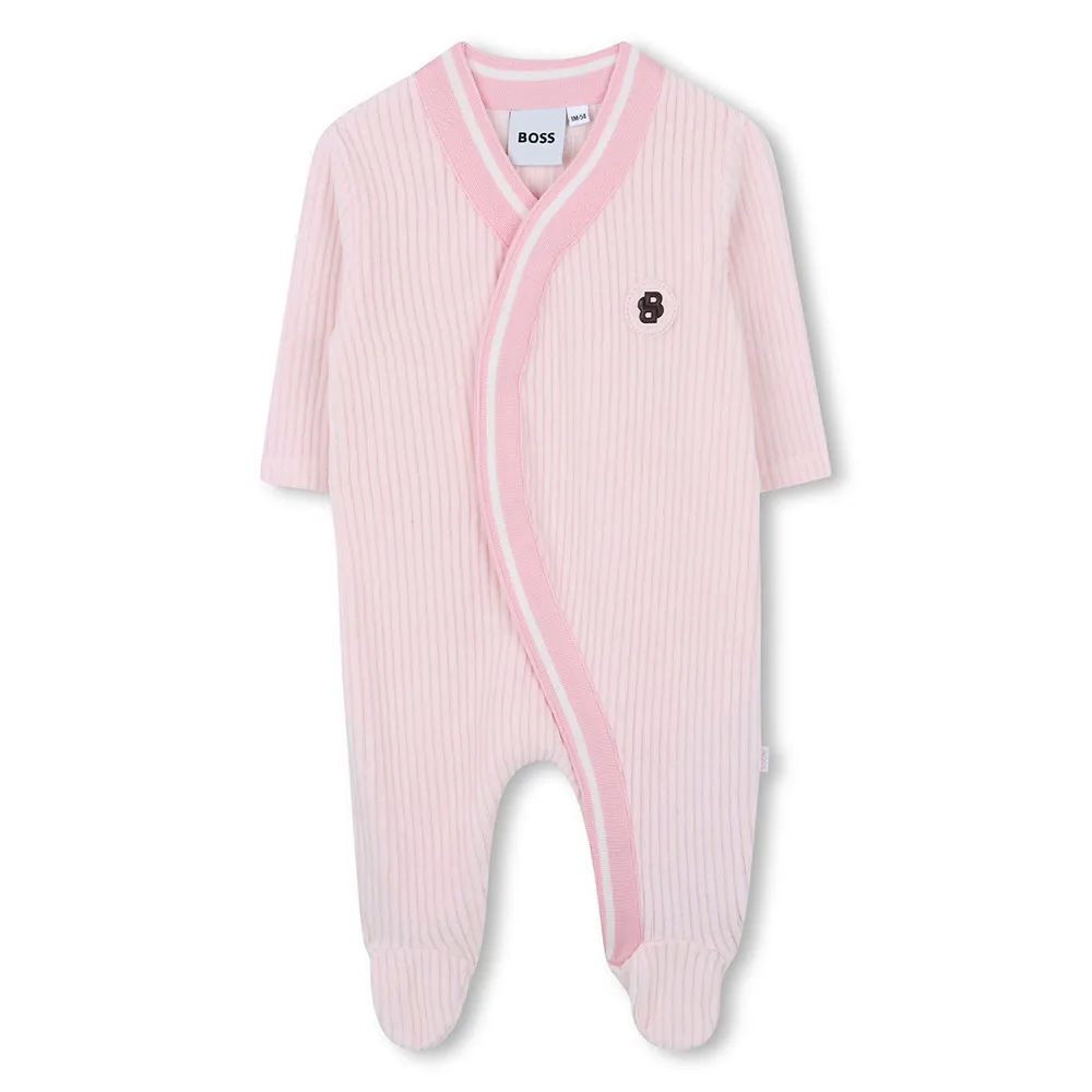 Prova la sensazione lussuosa di questo splendido set a due pezzi. Il pezzo forte è un bellissimo pigiama a maniche lunghe, progettato con copertura completa per offrire calore e comfort per tutta la notte o durante i momenti di relax diurni. Il motivo a righe all-over in un morbido tessuto di velluto è meravigliosamente soffice al tatto, offrendo un delicato abbraccio sulla pelle delicata. La funzionalità incontra la moda con una pratica chiusura a scatto che corre lungo la parte anteriore, consentendo una vestizione e un cambio rapidi e senza sforzo—una caratteristica che ogni genitore apprezzerà. Un discreto ma distintivo badge BOSS in silicone è elegantemente posizionato sul petto, a significare il marchio di qualità del brand, mentre un´etichetta con logo tessuta sul lato aggiunge un ulteriore tocco di autenticità al marchio.