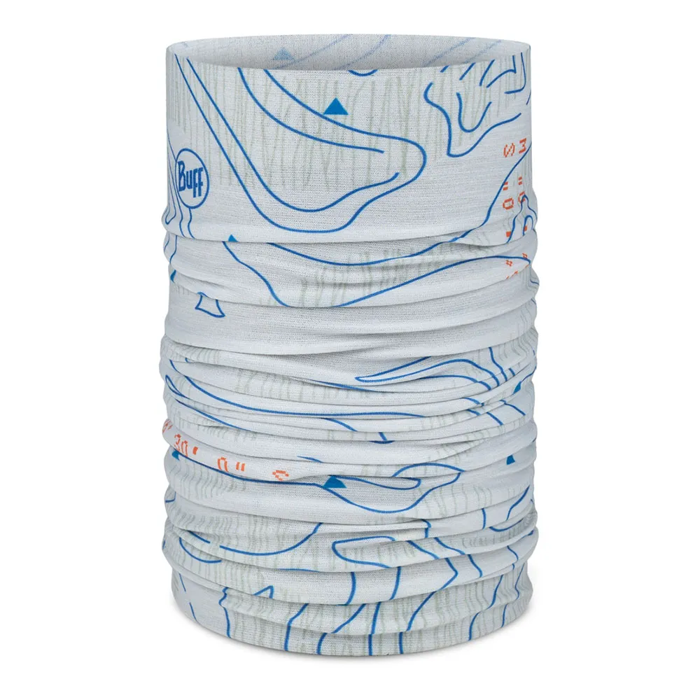 Scaldacollo multifunzionale leggero realizzato con bottiglie di plastica riciclate, che offre protezione solare UPF 50 e proprietà di raffreddamento evaporativo.