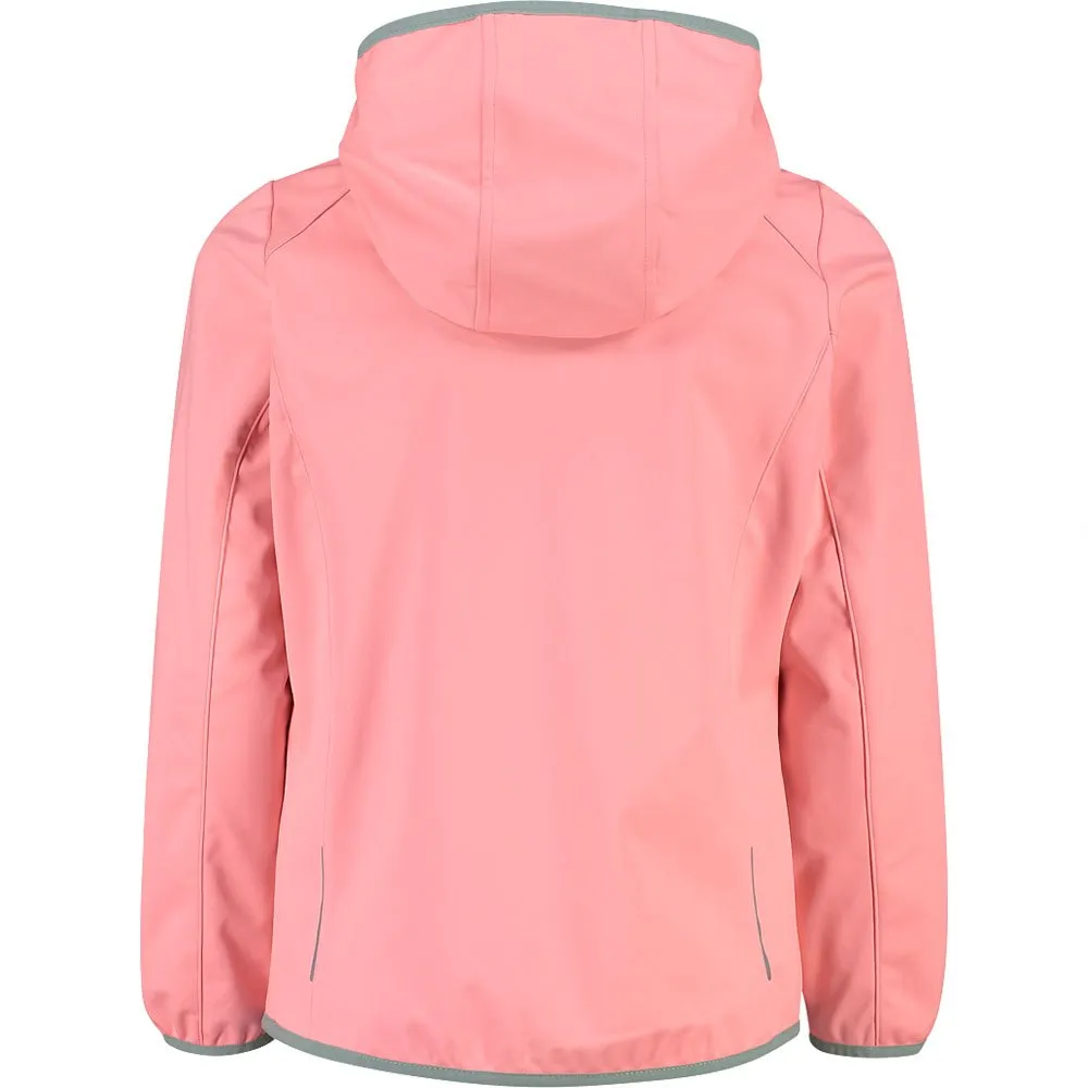 Giacca antivento softshell leggera da bambina con cappuccio fisso.