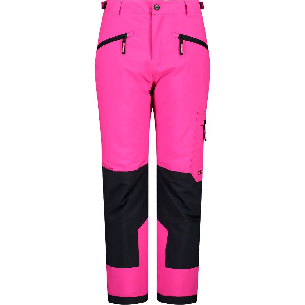Vita ergonomica, due tasche laterali con zip e una sulla gamba, ghetta antineve interna.