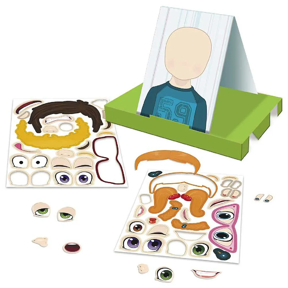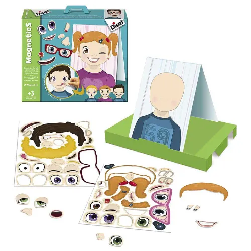 Lavagna bifacciale e 2 fogli magnetici per creare volti ed espressioni differenti.