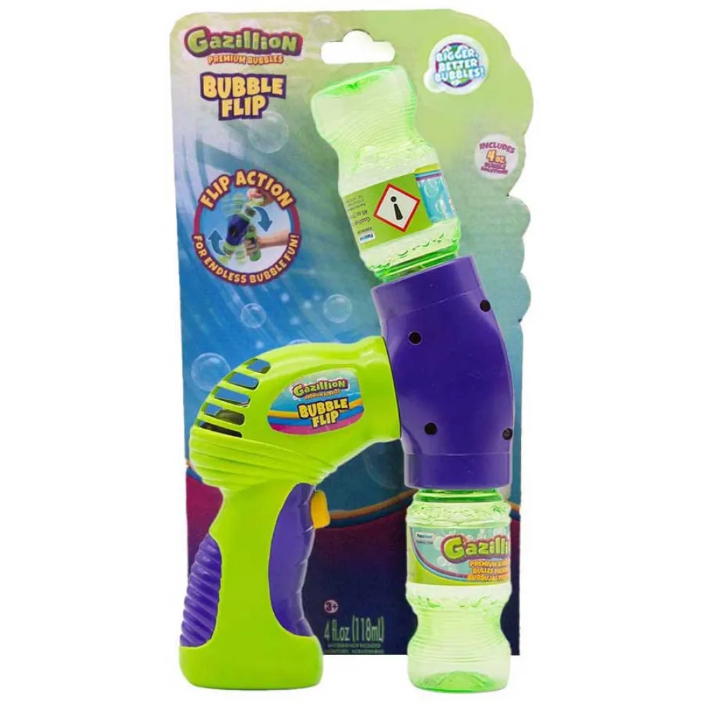 Presentazione di Gazillion Bubble Flip per un flusso continuo di divertimento con le bolle. Con il design flip action, il divertimento con le bolle non finisce mai. Carica ruotando la bottiglia di soluzione da 4 once nel blaster a bolle, una volta pieno premi il grilletto per iniziare a soffiare un flusso di bolle. Una volta che la bottiglia è vuota, ruota la parte anteriore del blaster, usa la bottiglia come maniglia e premi di nuovo il grilletto per un'ulteriore azione esplosiva! Ogni tappo a bolle include una bottiglia da 4 once di Gazillion Bubbles Solution.