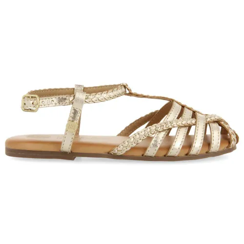 Sandali multi-cinghie in pelle metallizzata oro con alcune cinghie intrecciate.