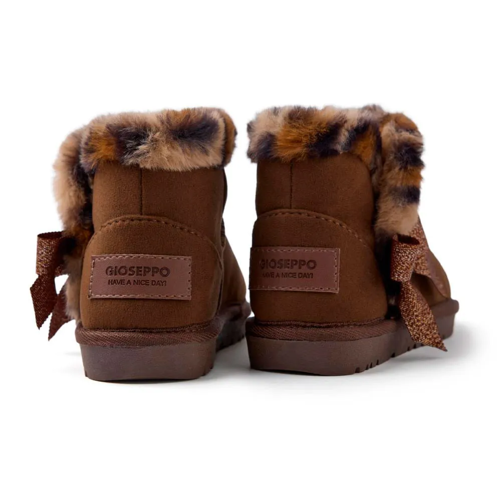 Stivaletti australiani con fiocco e collo in pelliccia con stampa leopardata.