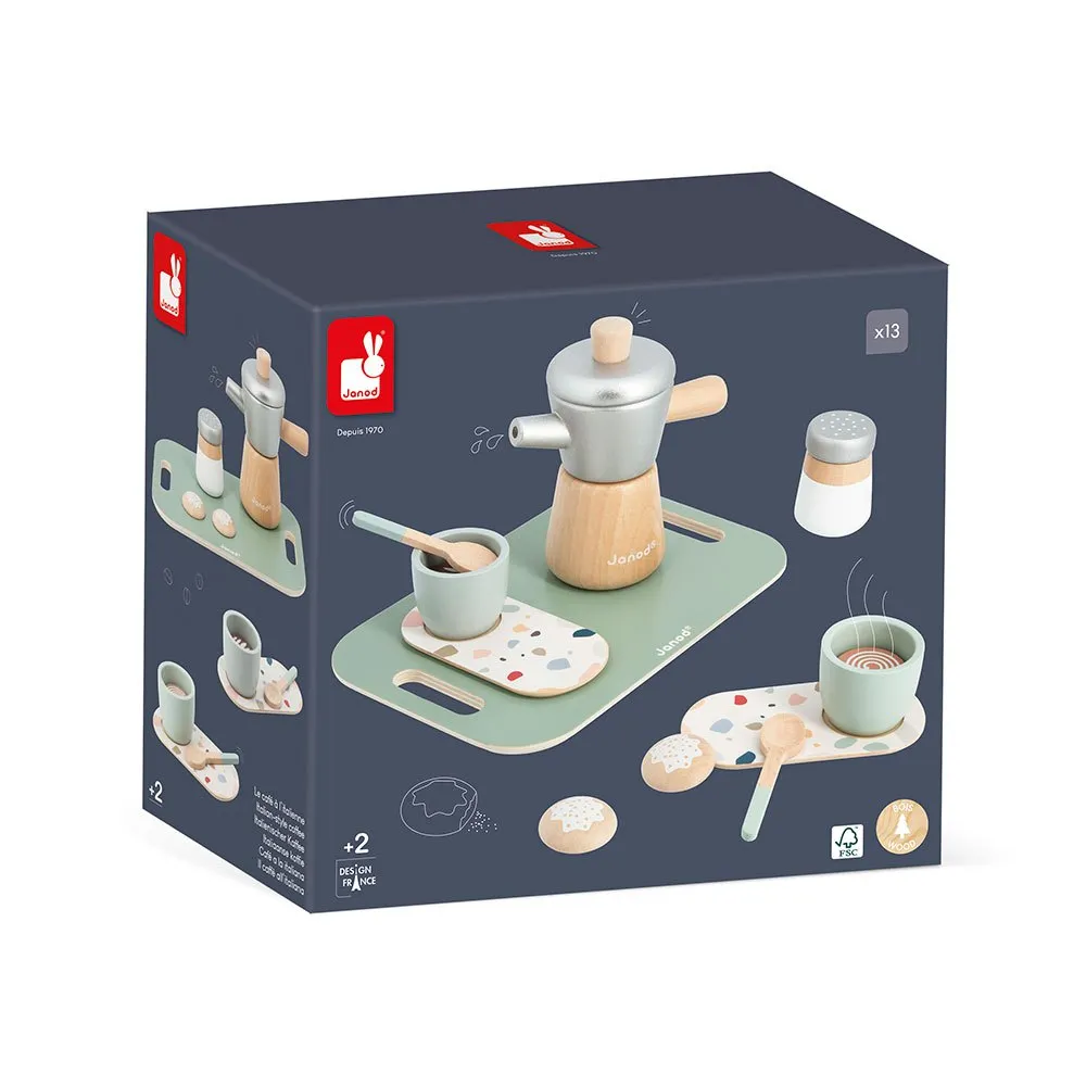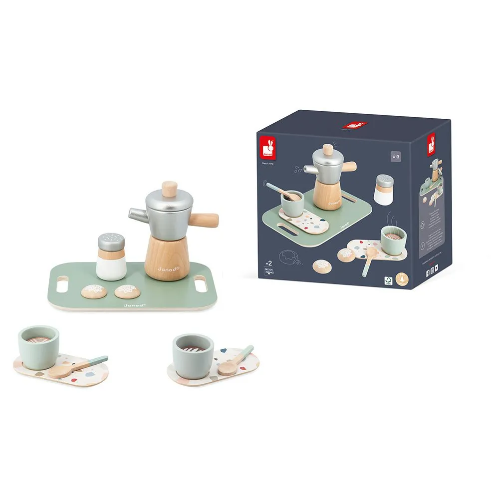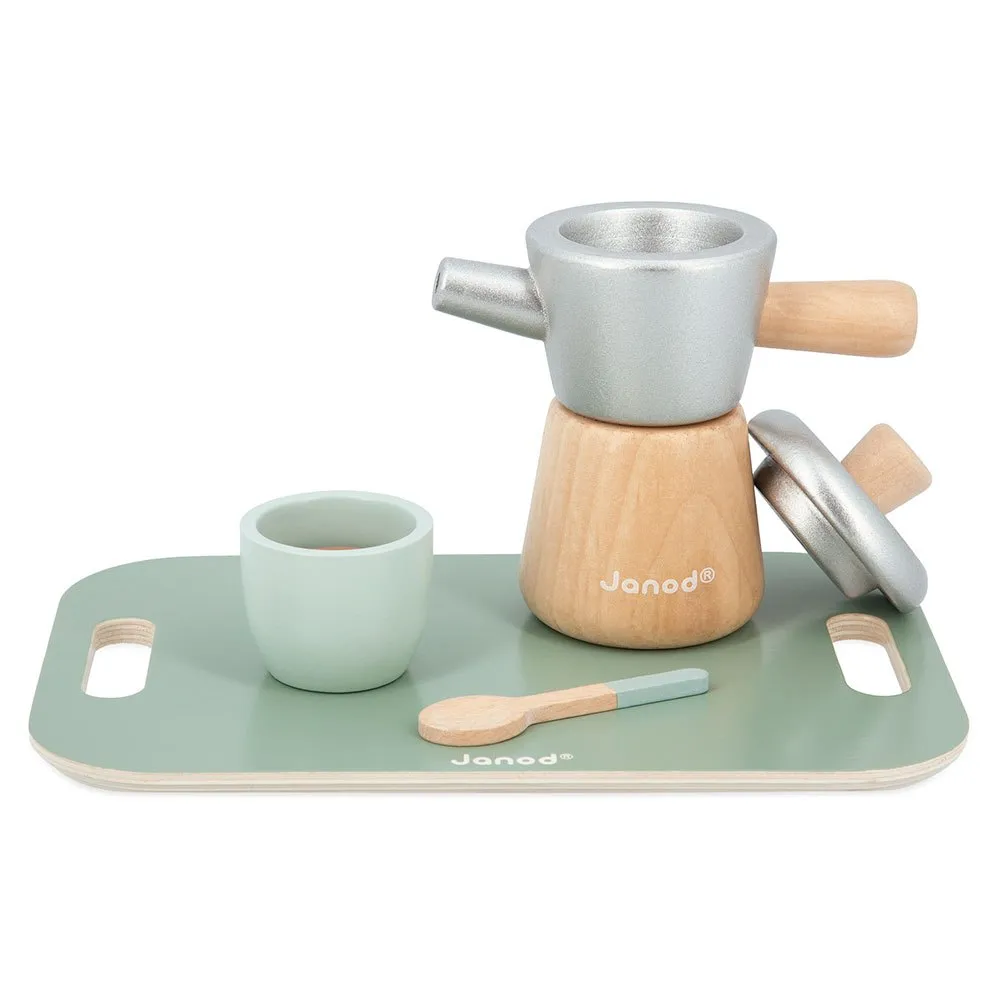 Perché è importante fare come fanno gli adulti, questo set include una caffettiera, 2 tazze, 2 cucchiai, 2 piattini e una zuccheriera.