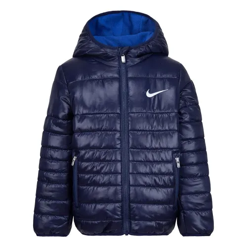 La giacca presenta un elegante colore blu notte, che conferisce un fascino moderno e versatile. È completato dall´iconico logo Nike sul petto, che aggiunge un tocco sportivo al design generale. La tonalità blu notte si abbinerà senza sforzo a vari outfit, diventando facilmente una giacca di riferimento per i bambini.