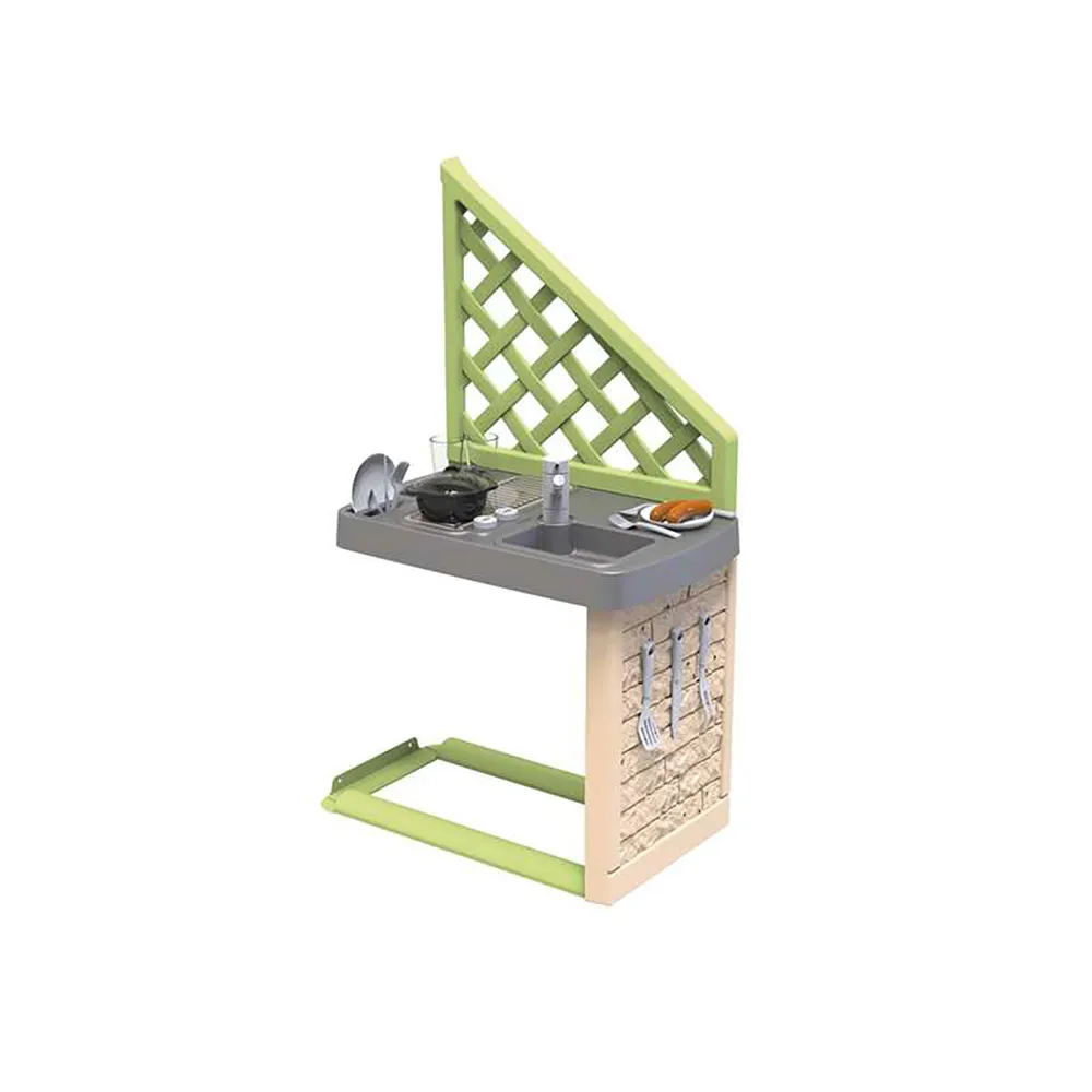 La cucina estiva Smoby Life, realizzata con almeno il 60% di plastica riciclata, è l´aggiunta perfetta a una varietà di casette Smoby. Qui, i piccoli chef possono liberare la loro creatività e preparare i loro piatti preferiti. Disponibile separatamente, può essere montata facilmente e in sicurezza sulla parete esterna della casetta grazie alle istruzioni dettagliate. È dotata di un´area cottura per cucinare e grigliare, o per preparare perfettamente tutti gli ingredienti. Con 17 accessori, tra cui piatti, posate e salsicce grigliate, i bambini possono dare libero sfogo alla loro immaginazione. Tutto può essere pulito nel lavandino.