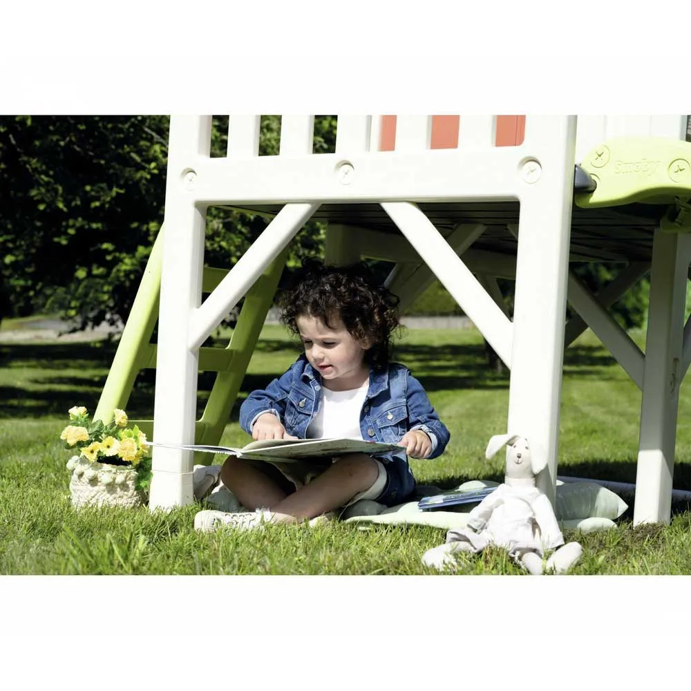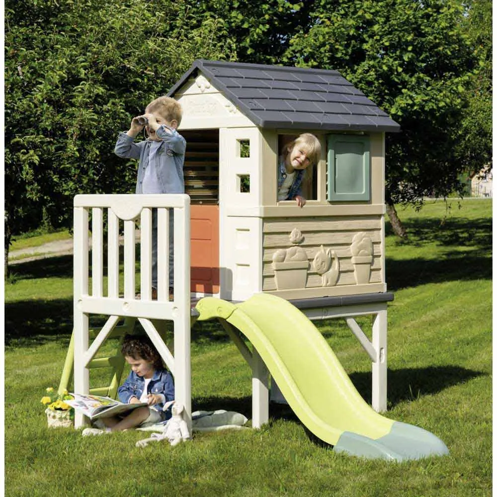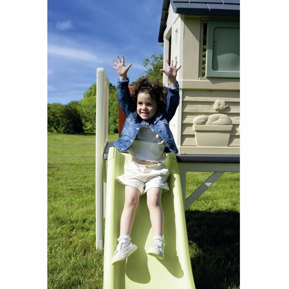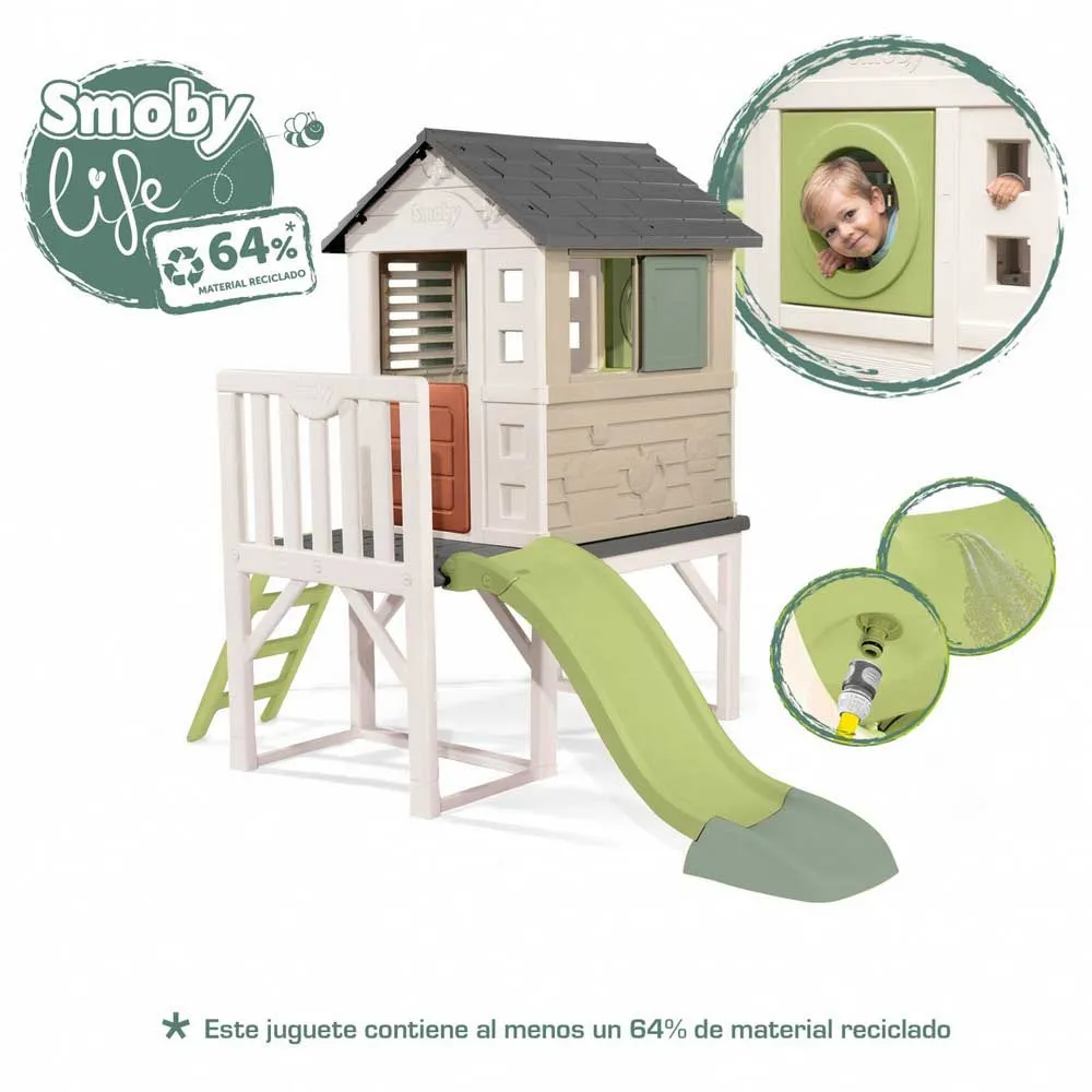 Con la nuova casetta Smoby Life Stelzenaus, realizzata con almeno il 60% di plastica riciclata, i bambini possono trasferirsi nella loro prima casa! La casa dei sogni per il giardino si erge su robusti trampoli e dispone di una veranda, una scala da arrampicata e un fantastico scivolo. Grazie allo speciale processo di fabbricazione, questa casa unica nel suo genere, realizzata in plastica di alta qualità, è particolarmente stabile. Rispetto alle case in legno, è più leggera, facile da pulire e lavabile, oltre che rapida e facile da montare. Due finestre con persiane scorrevoli, un oblò e una mezza porta completano le caratteristiche a misura di bambino di questa versatile casetta, rendendola un´ottima aggiunta a giardini, patii o camerette. Lo scivolo è lungo 1.50 m e termina in un´ampia scivola che garantisce un atterraggio delicato. Lo speciale punto forte per le calde giornate estive è che lo scivolo può essere trasformato in uno scivolo d´acqua in pochi semplici passaggi. Basta collegare un normale tubo da giardino (non incluso) alla parte inferiore dello scivolo e il divertimento acquatico può iniziare. La casa su palafitte Smoby è realizzata in plastica resistente ai raggi UV ed è quindi particolarmente resistente agli agenti atmosferici e allo sbiadimento. La versatile casetta per bambini può essere ampliata con i set di accessori per casette Smoby.