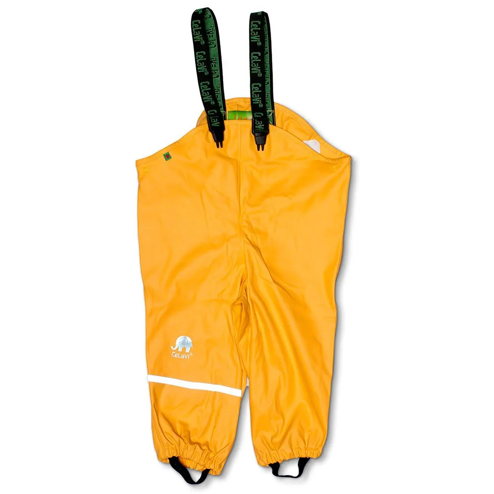 In maat 110-150, maar in sommige kleuren tot 170, worden de regenbroeken geleverd met elastische tailleband (maat 110-140) en alleen het Celavi logo op de borst en het been.