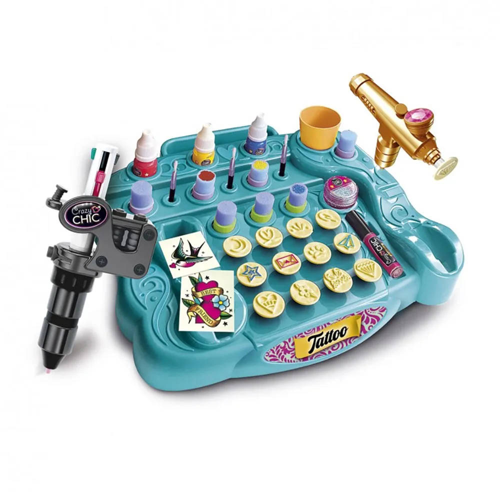Het bevat ook body paints om de tattoos te kleuren, sponzen, applicators, stencils, en een tattoo boek met tekeningen, tips, en blanco vellen voor je favoriete tattoos.