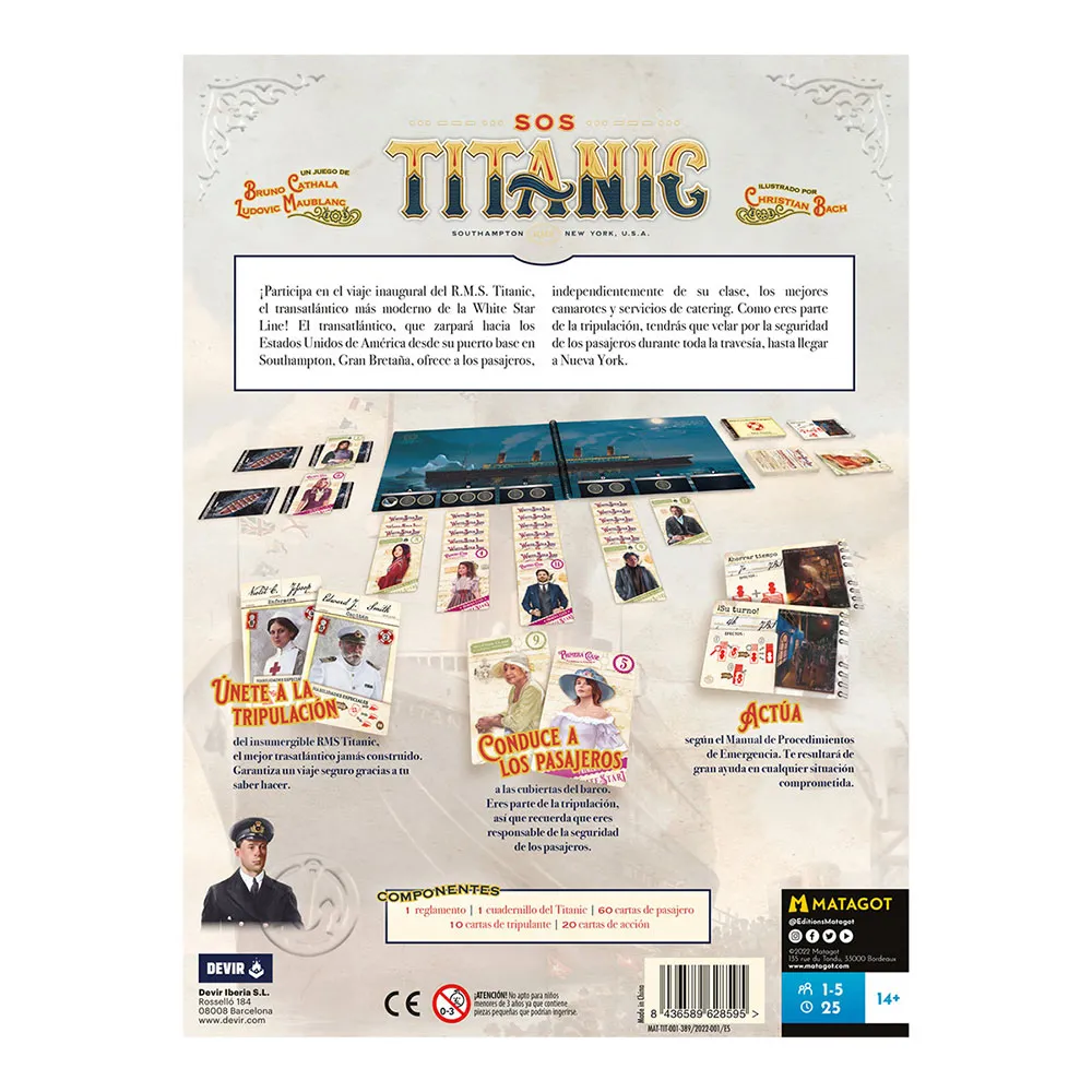 De Titanic is tegen een ijsberg gevaren, en paniek heeft de passagiers gegrepen! In dit spannende coöperatieve spel ben je een bemanningslid met een heroïsche missie: zoveel mogelijk levens redden voordat het schip zinkt. Werk alleen of met maximaal 4 andere spelers om chaotische passagiersrijen te beheren en hen in numerieke volgorde naar reddingsboten te evacueren. Elk bemanningslid heeft unieke vaardigheden, maar uitdagingen zijn er in overvloed naarmate compartimenten onderlopen en klasseregels voorkomen dat passagiers zich mengen. Van de ontwerpers Bruno Cathala & Ludovic Maublanc, bevat deze meeslepende uitdaging een uniek notitieboek-speelbord dat de ondergang van het schip toont. Hoeveel red jij er van de ramp?