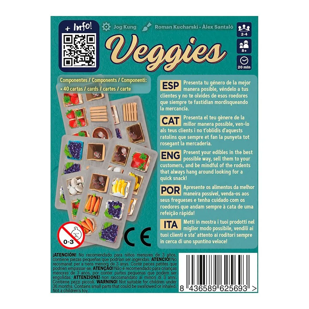 In veggies moet elke speler 8 kaarten combineren om de beste en meest diverse positie te creëren, in een poging om het grootste aantal groepen goederen te krijgen.