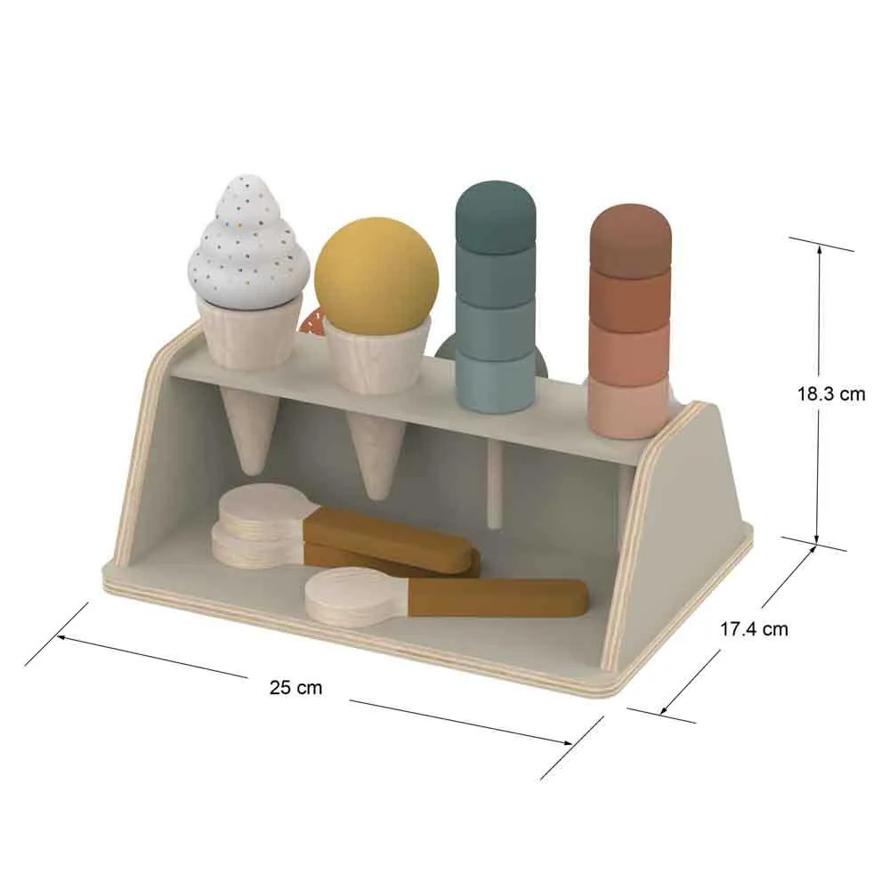 Met deze natuurlijke houten ijsjesset kan je kindje op warme zomerdagen ijsjes serveren en de show stelen voor de speelgoedwinkel door de rol van gulle ijscoman te spelen.