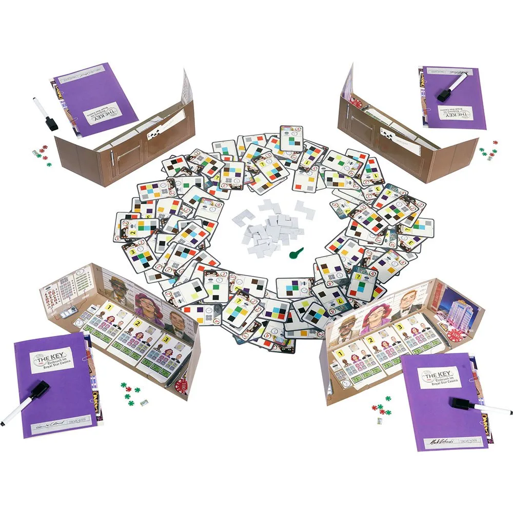 4 aktetassen (scherm), 4 onderzoeksdossiers, 4 stiften met gum, 9 houten sleutels, 1 oplossingsbord, 4 liftmarkeringen, 20 wildcard-fiches, 17 sjabloondelen, 140 kaarten: