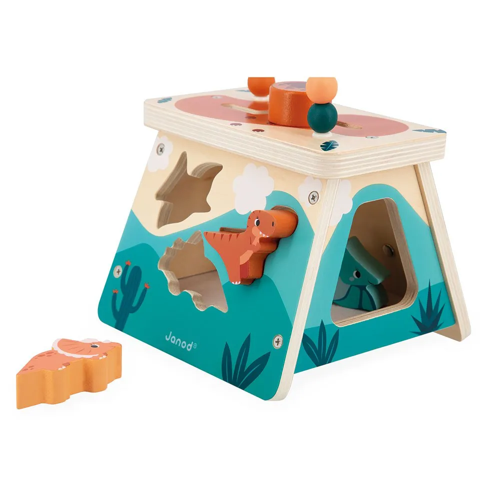 Op het voorpaneel vind je een vormdoos met een tyrannosaurus, een triceratops en een pteranodon die in de bijbehorende vorm passen.