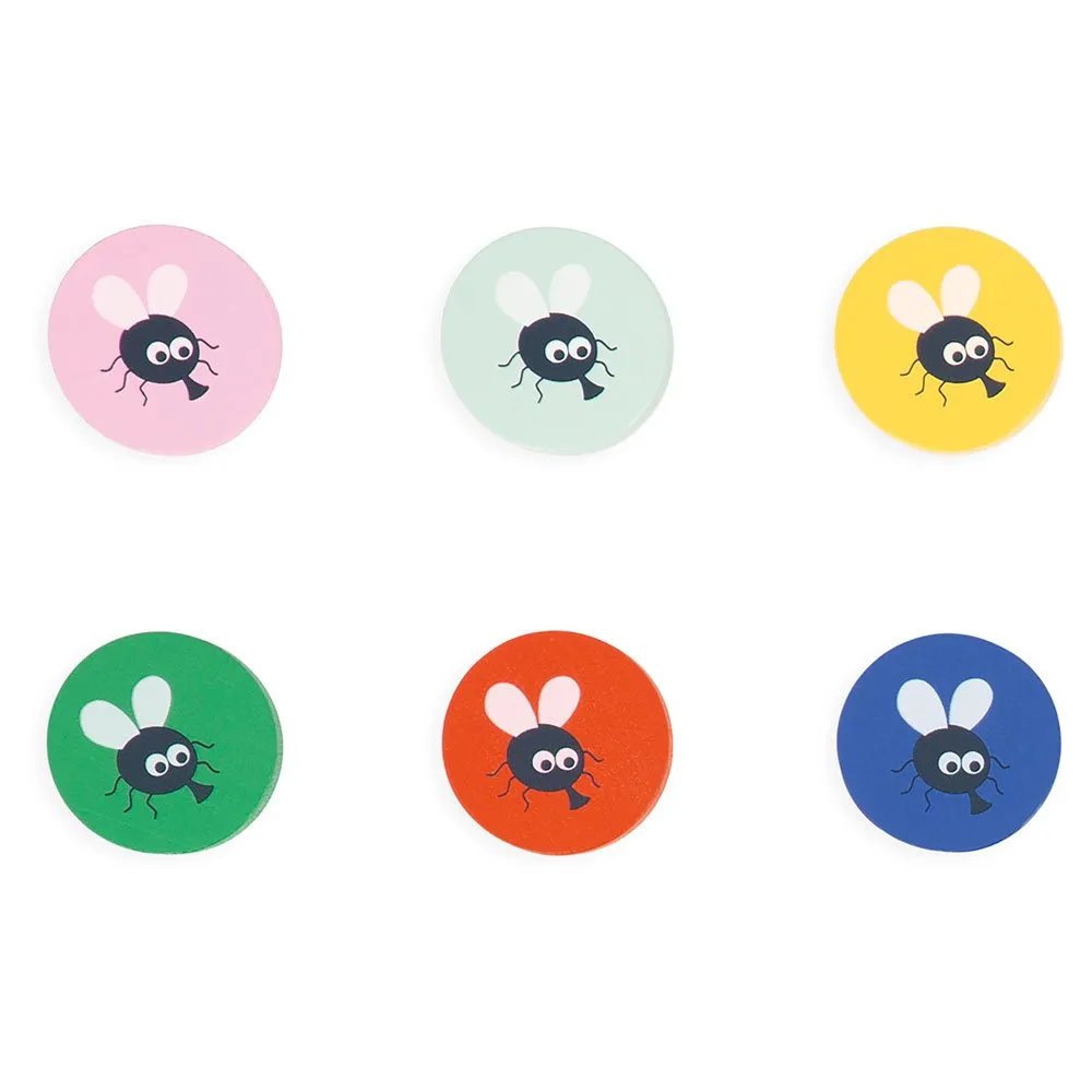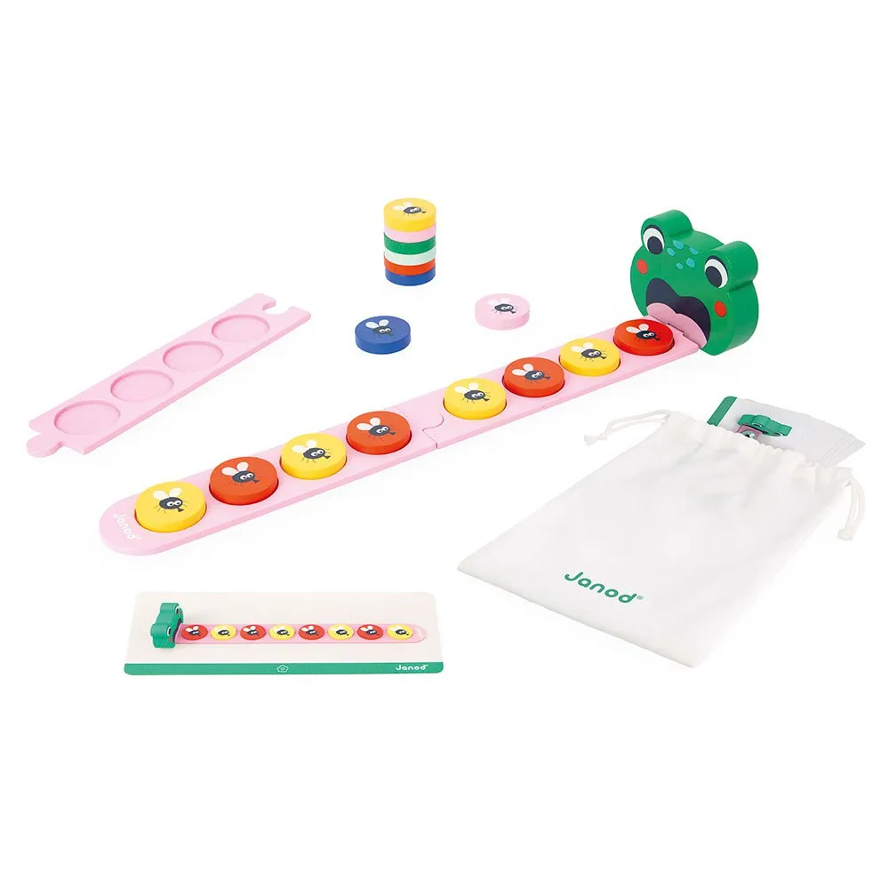 Dit spel bestaat uit een houten kikker, een tong verdeeld in 3 in elkaar grijpende stukken, 36 vliegjes op gekleurde schijven en 12 sjabloonkaarten.