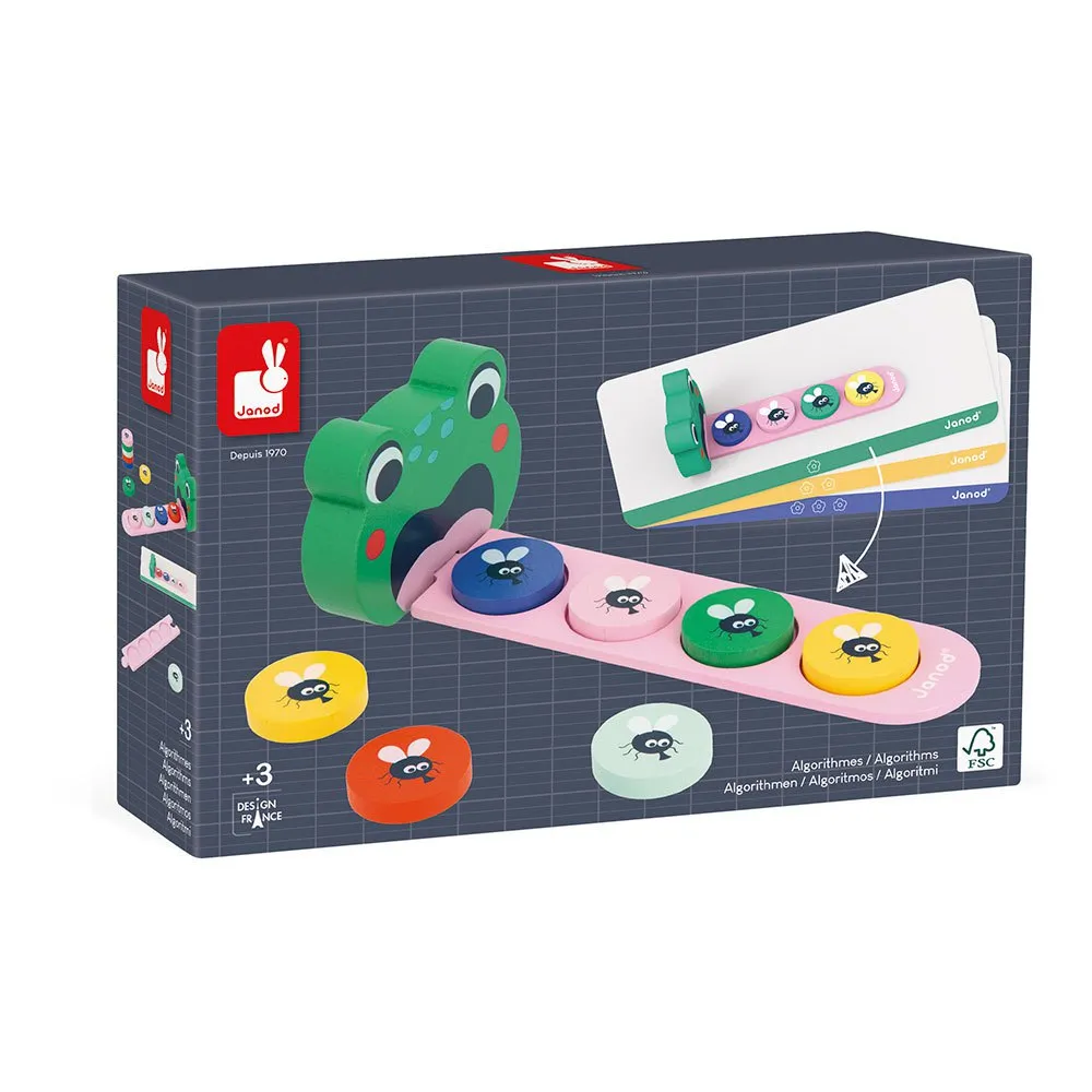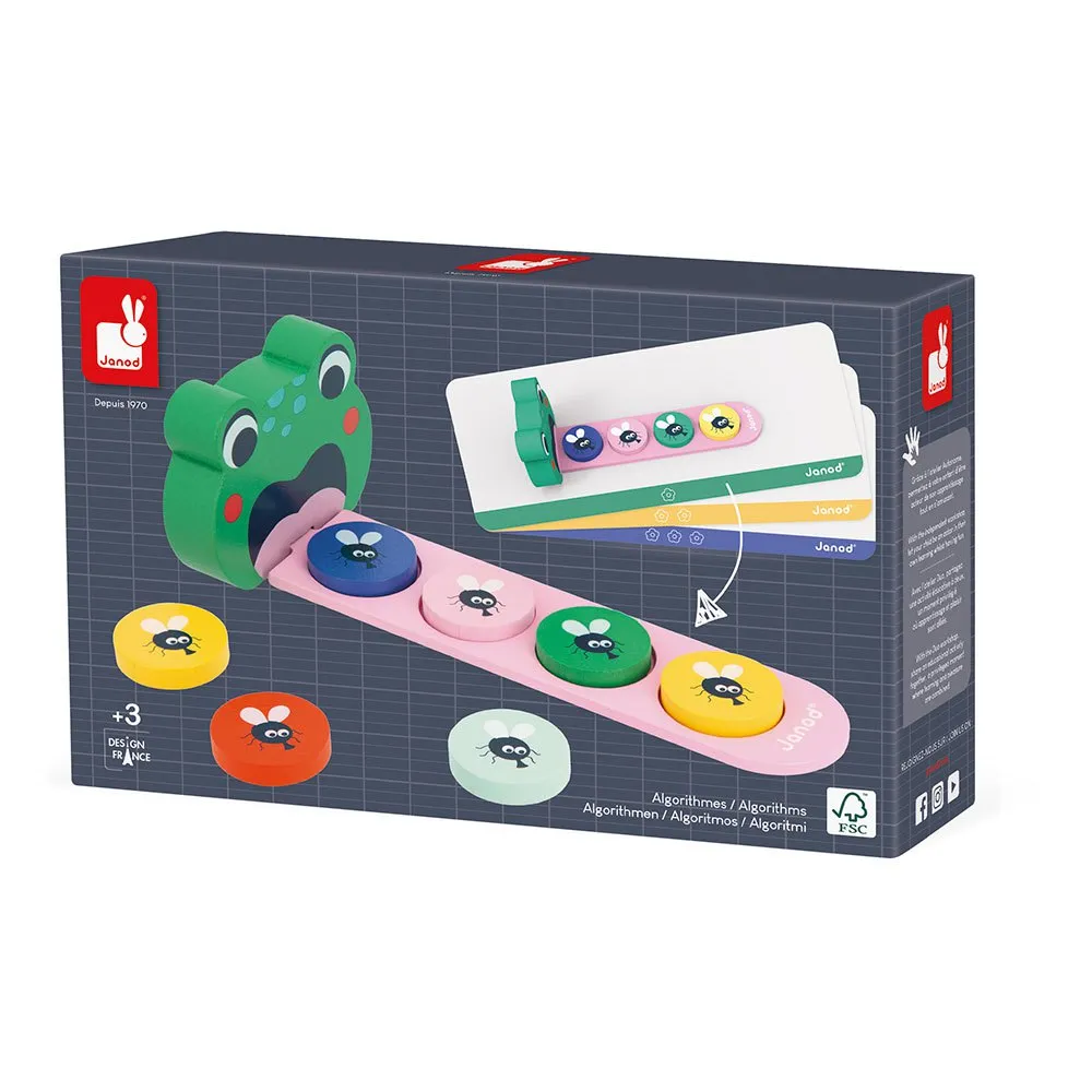 Door vliegjes op de tong van de kikker te plaatsen, leert uw kind op een leuke manier een logische volgorde van kleuren te reproduceren en te herkennen.