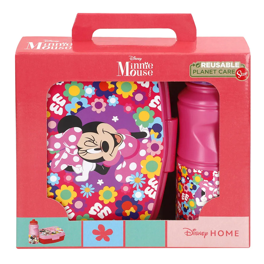 Neem de magie van Minnie Mouse overal mee naartoe! Deze officieel gelicentieerde kinder set bevat een broodtrommel met een veilige sluiting, makkelijk te openen voor kleine handjes, en een 380ml fles met schroefdop en flip-top tuit.