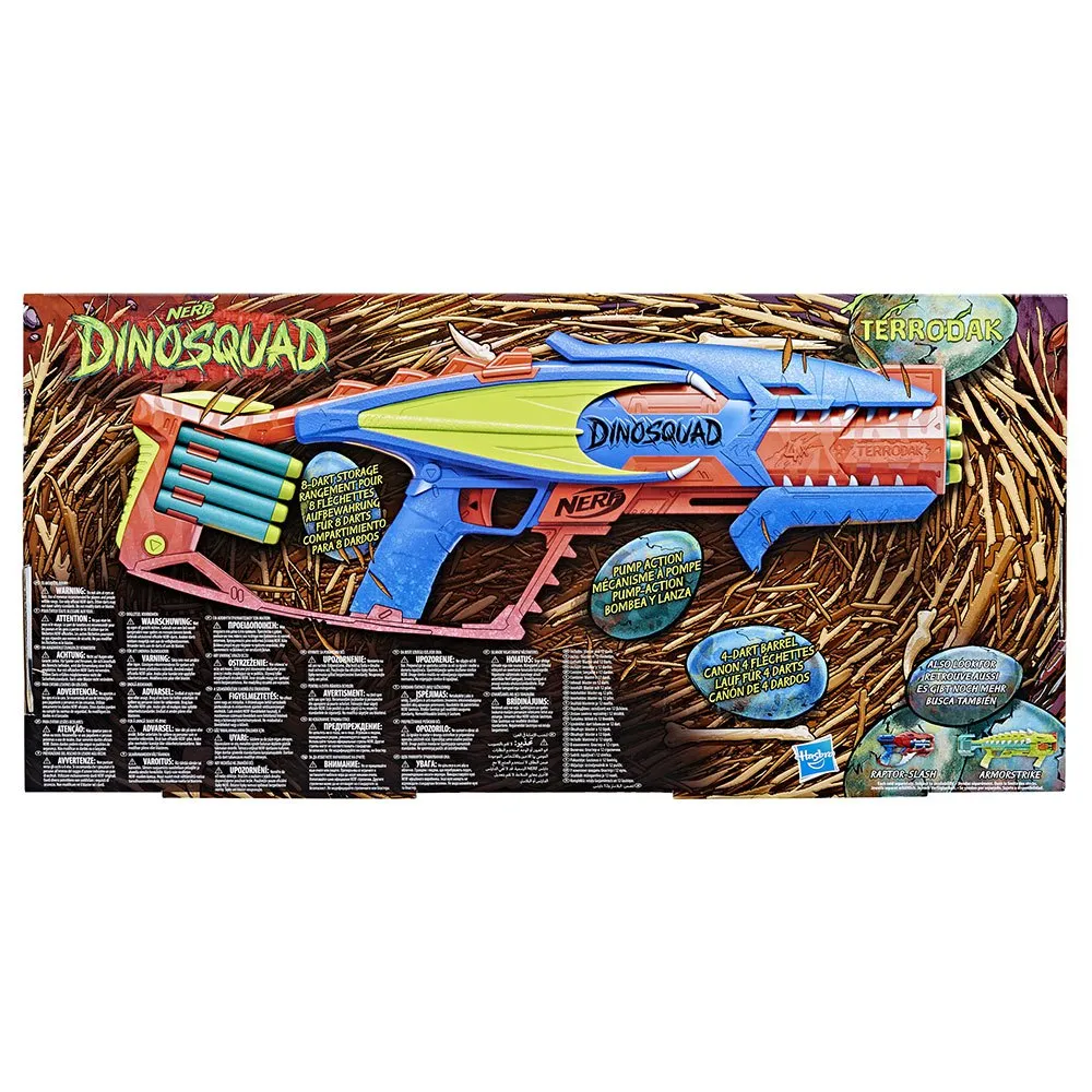 Sluit je aan bij een team van legendarische dinosaurussen als lid van de elite DinoSquad! Maak gebruik van de buitengewone kracht van de krachtigste dinosaurussen en beleef ongelooflijke avonturen tijdens het buitenspelen! Kinderen zijn klaar voor buitenspelen met de Nerf DinoSquad Terrodak blaster die een cool dinosaurusontwerp heeft dat het uiterlijk van een pterodactylus vertegenwoordigt.