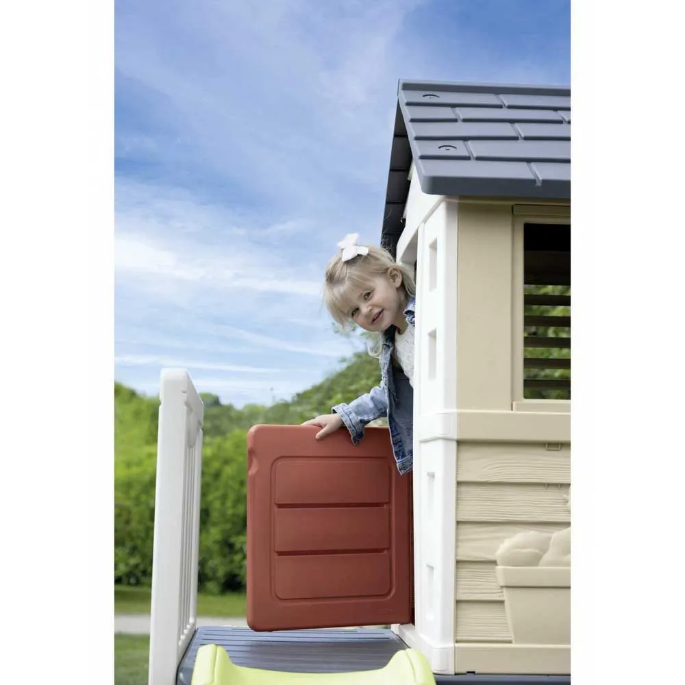 Met het nieuwe Smoby Life speelhuis Stelzenaus, gemaakt van minstens 60% gerecycled plastic, kunnen kinderen in hun eerste huis intrekken! Het droomhuis voor de tuin staat op stevige palen en heeft een veranda, een klimladder en een geweldige glijbaan. Dankzij het speciale productieproces is dit unieke huis van hoogwaardig kunststof bijzonder stabiel. Vergeleken met houten huizen is het lichter in gewicht, gemakkelijk schoon te maken en afwasbaar, en snel en eenvoudig te monteren. Twee ramen met schuifluiken, een patrijspoort en een halve deur completeren de kindvriendelijke kenmerken van dit veelzijdige speelhuis, waardoor het een geweldige aanvulling is op tuinen, patio´s of kinderkamers. De glijbaan is 1.50 m lang en eindigt in een brede glijgoot die zorgt voor een zachte landing. Het speciale hoogtepunt voor warme zomerdagen: de glijbaan kan in slechts een paar eenvoudige stappen worden omgebouwd tot een waterglijbaan. Sluit eenvoudig een standaard tuinslang (niet inbegrepen) aan op de onderkant van de glijbaan en het waterplezier kan beginnen. Het Smoby steltenhuis is gemaakt van UV-stabiel plastic en is daardoor bijzonder bestand tegen weersinvloeden en verkleuring. Het veelzijdige kinderspeelhuis kan worden uitgebreid met de Smoby speelhuis accessoiresets.
