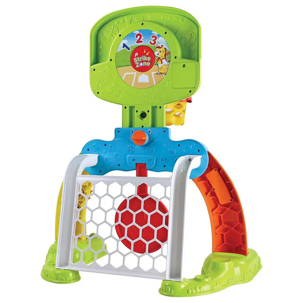 Peuters kunnen een basket schieten, een doelpunt maken of het doel raken met dit fantastische 3-in-1 sportcentrum.