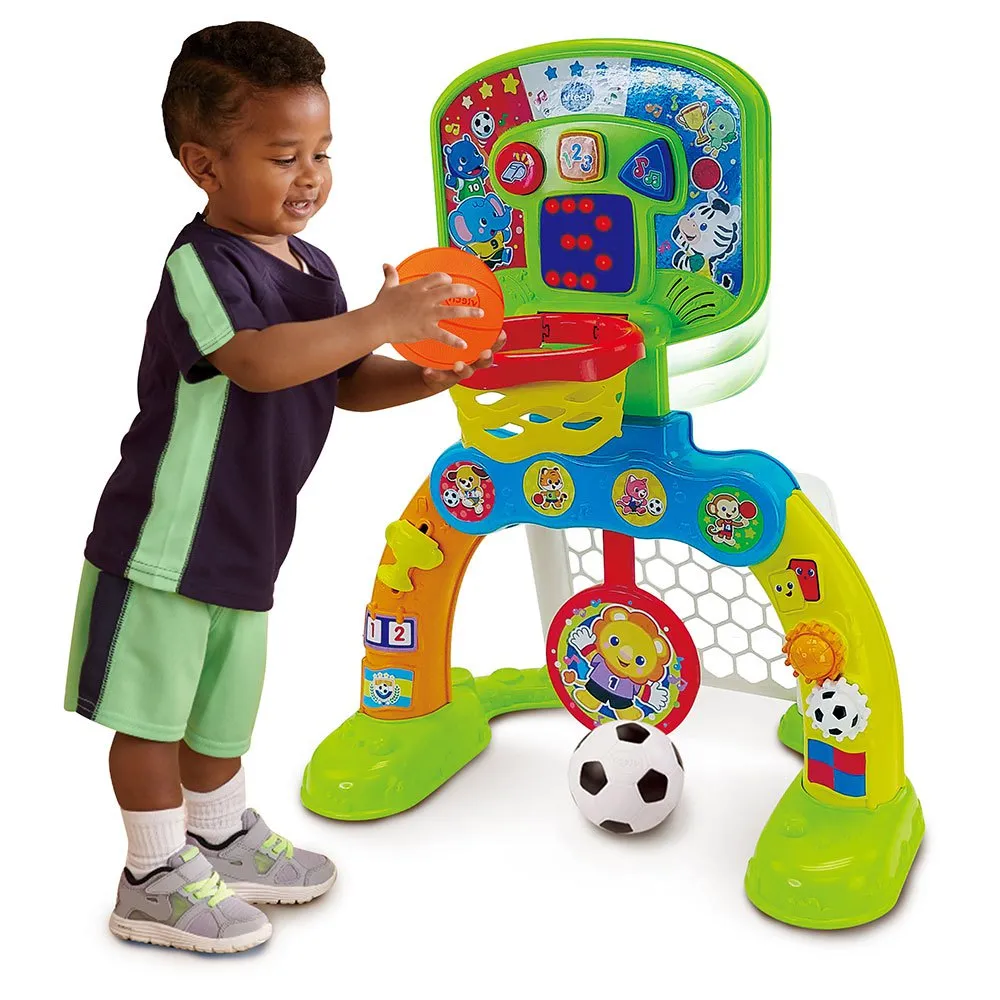 Schiet een basket, scoor een doelpunt of raak het doel! Verstelbaar, geanimeerd scorebord telt manden en speelt bemoedigende zinnen wanneer je een doelpunt scoort! Win het leerspel met de Centro de deportes Basket-Gol van VTech.