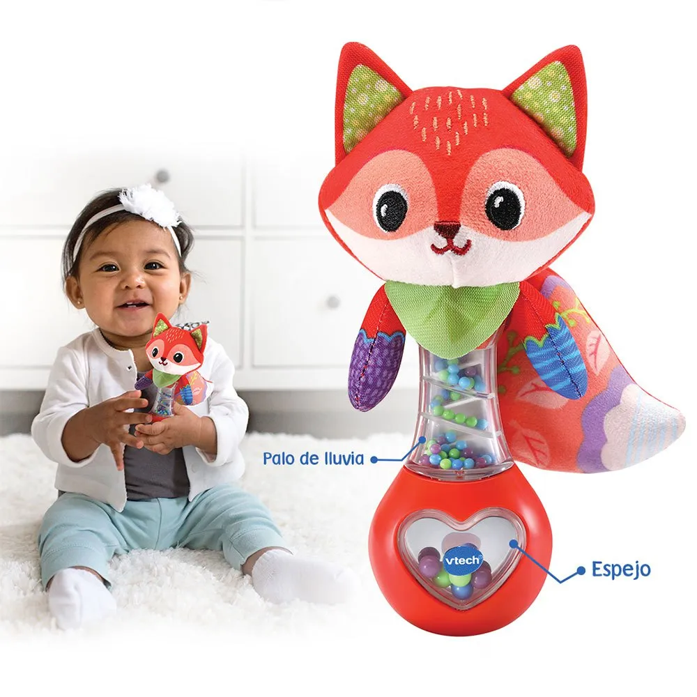 Wanneer je baby de rammelaar heen en weer zwaait, horen ze het rammelende geluid van de kralen en zien ze de staart van de vos bewegen.