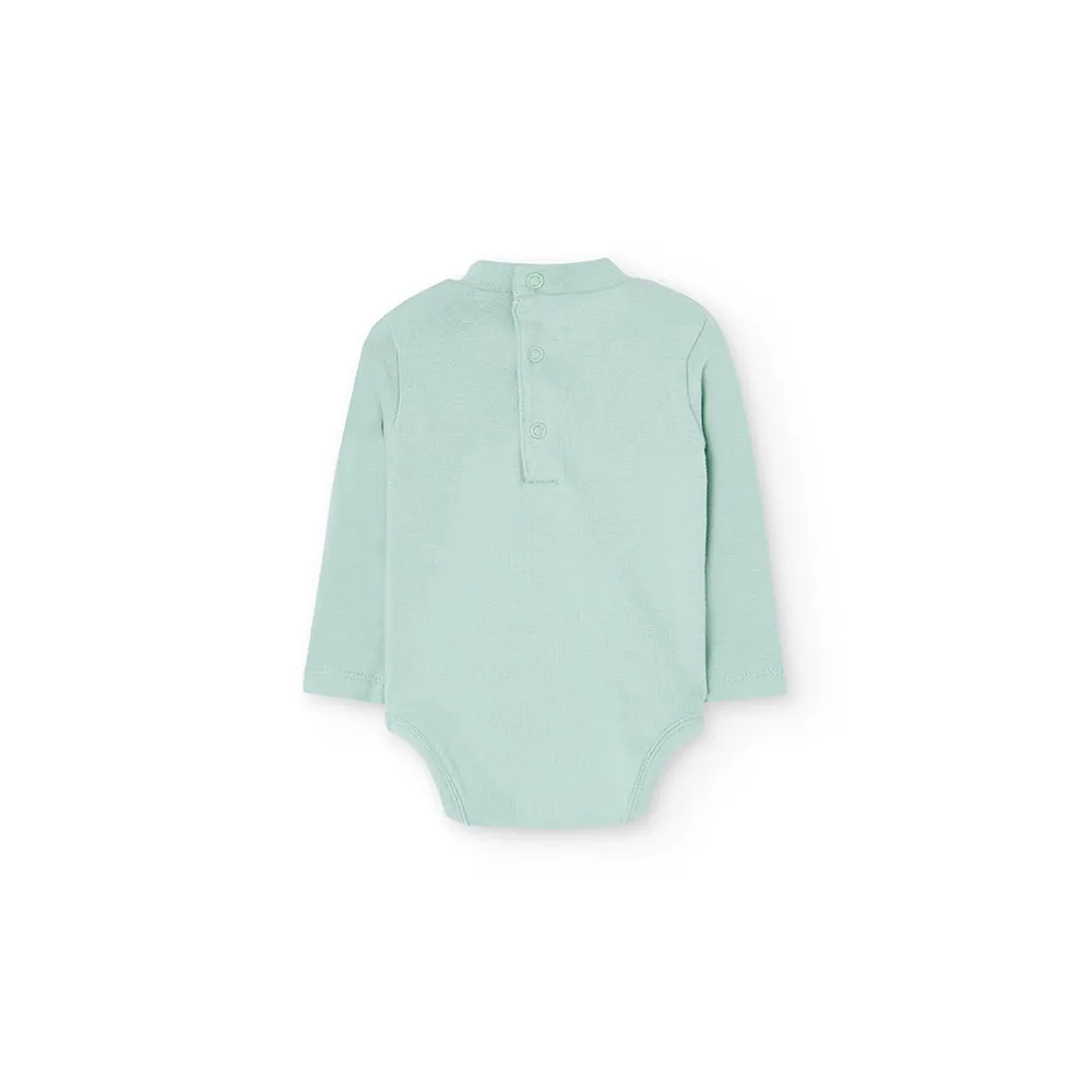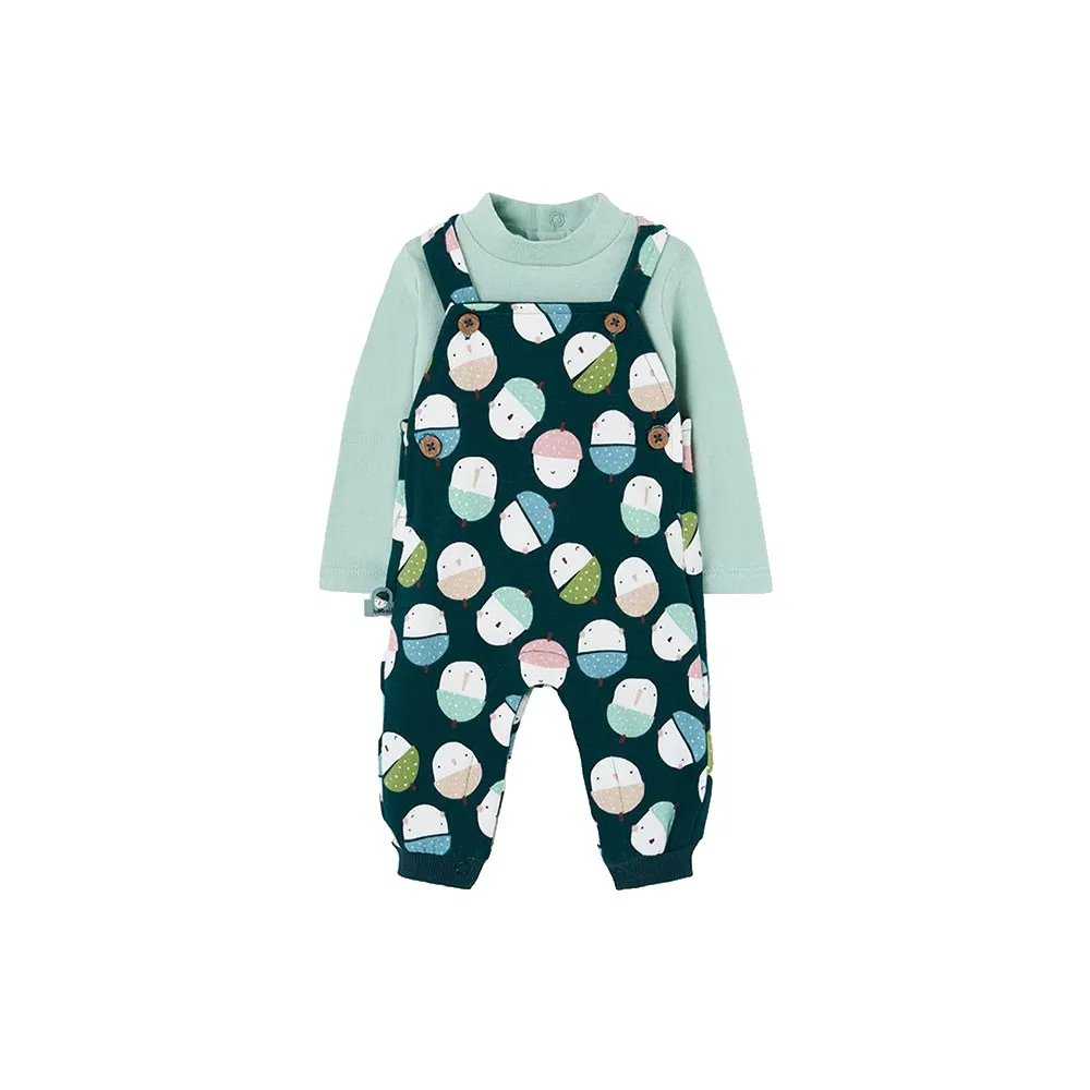 Lett grønt strikkesett til baby, bestående av en langermet body og sparkebukser med et smilende eikenøttmønster.