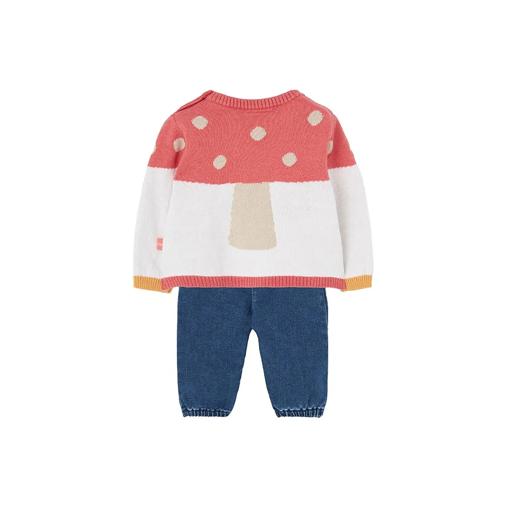 Strikket sett til baby i forskjellige farger med soppdetaljer, spesielt designet for høst- og vintersesongen.